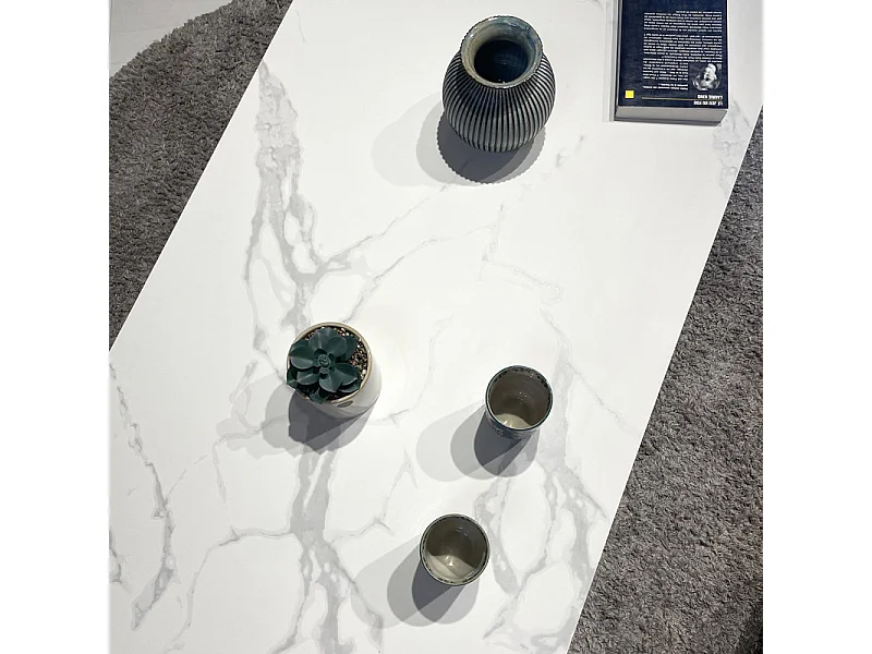 Table basse 130 cm céramique blanc pied croix métal beige - LIVANO