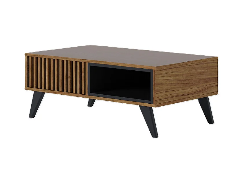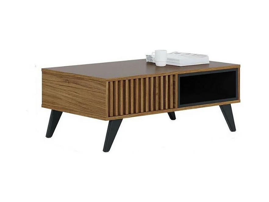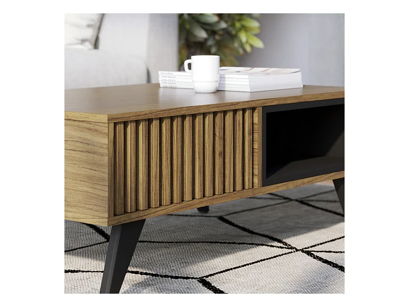 Table Basse 2 Niches 4 Pieds Bois Noyer et Noir L 90.5 H 54 P 35.2 cm