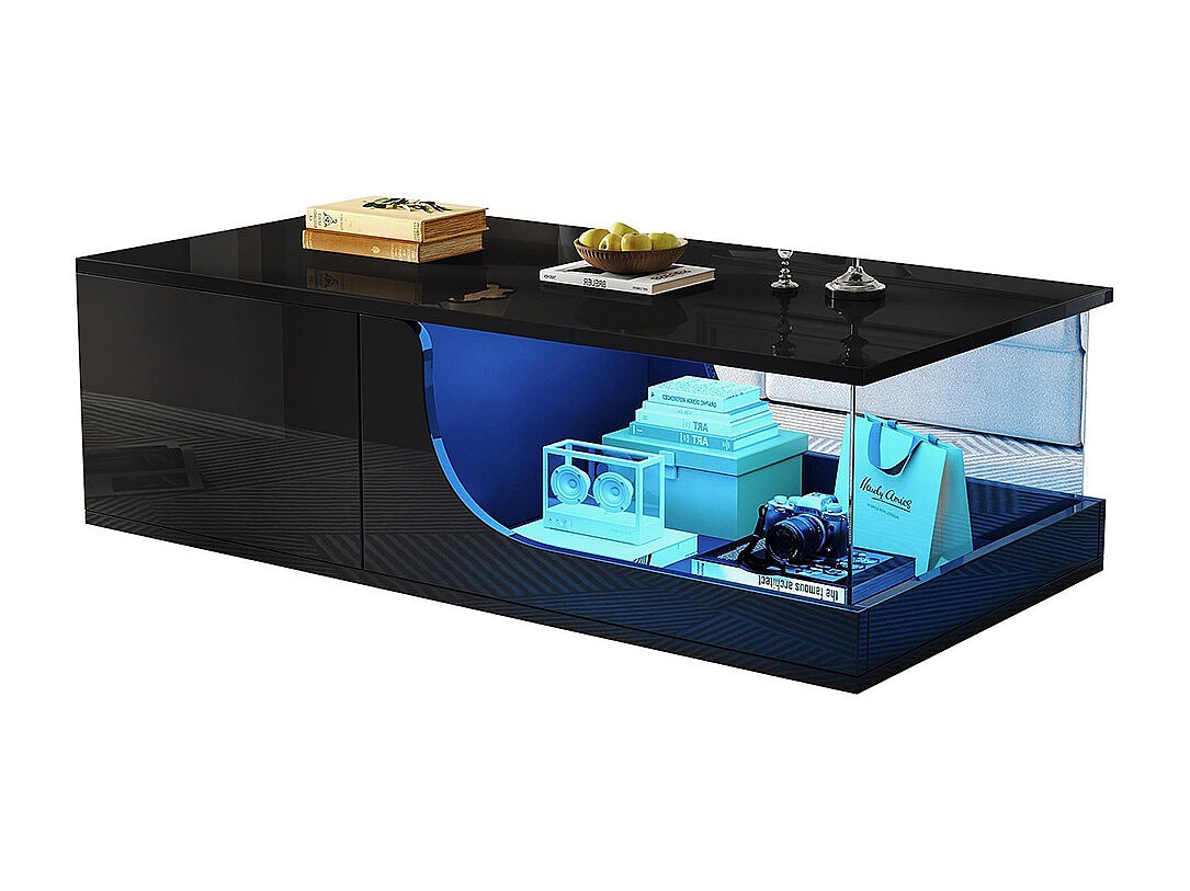 Table basse avec 2 tiroirs et LED, en MDF et acrylique, en noir laqué brillant