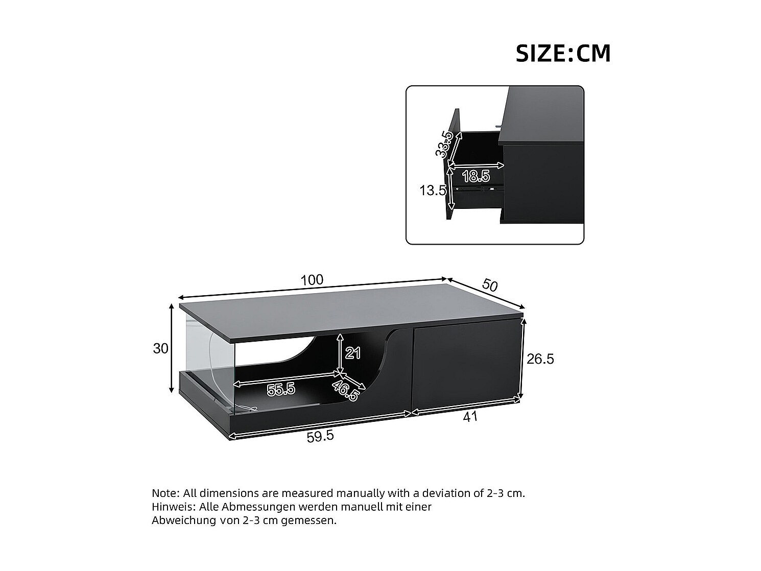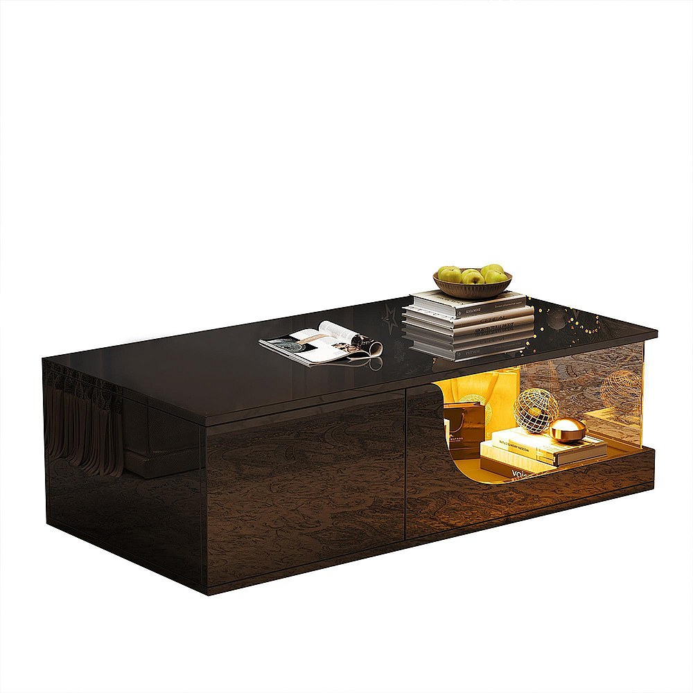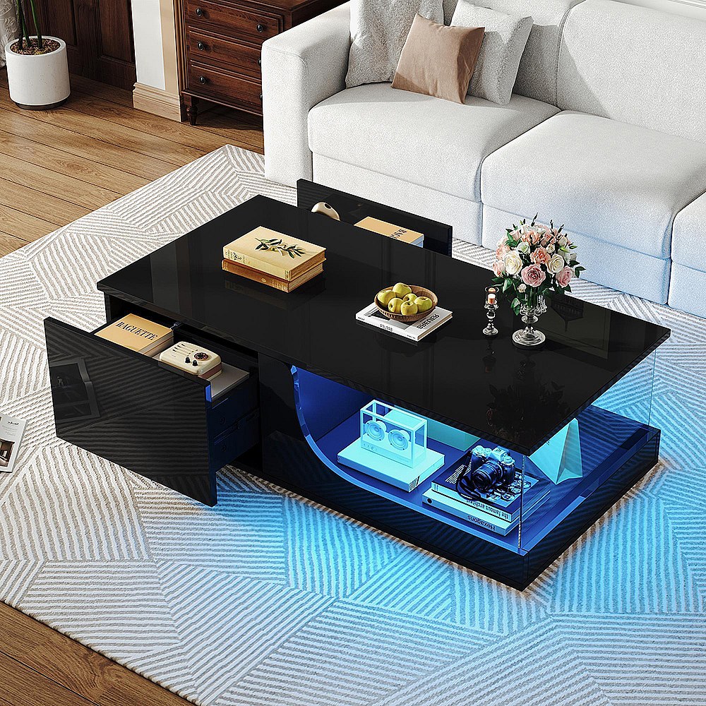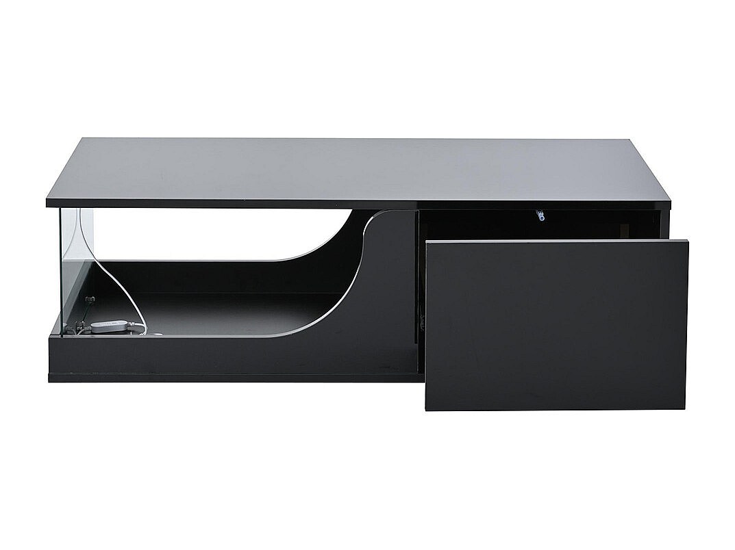 Table basse 100x50x35cm avec 2 tiroir et d'un compartiment semi-ouvert, LED, noir laqué