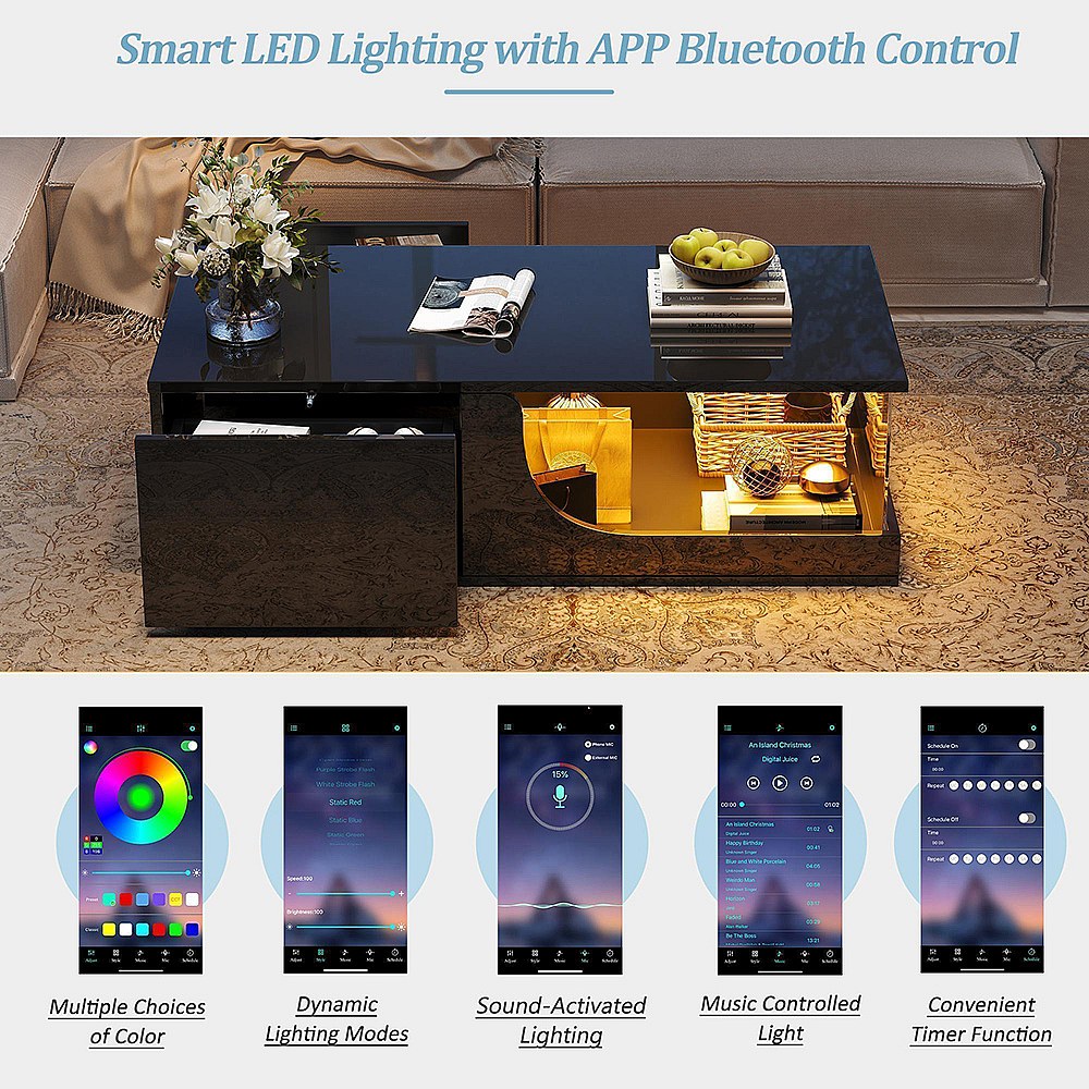 Table basse moderne avec tiroirs et étagères, LED, Noir laqué