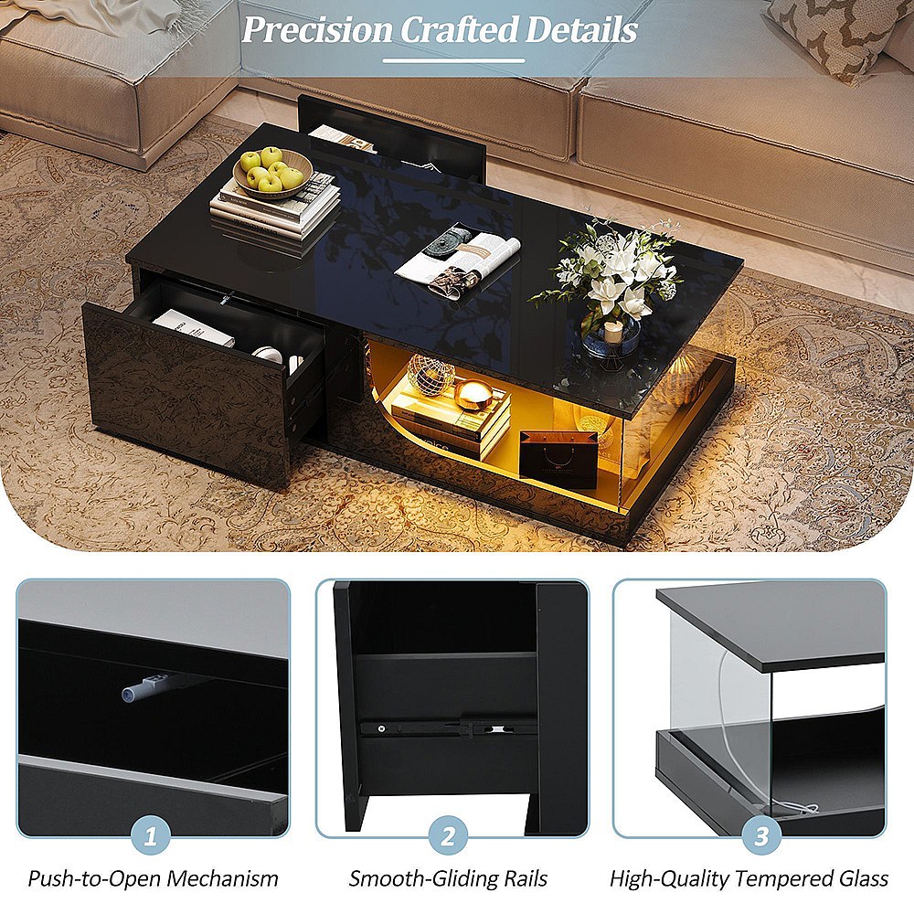 Table basse avec 1 tiroir, plateau en verre trempé, LED inclus, corps en noir laqué brillant