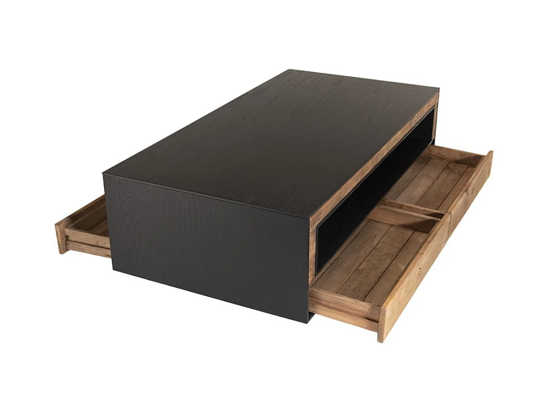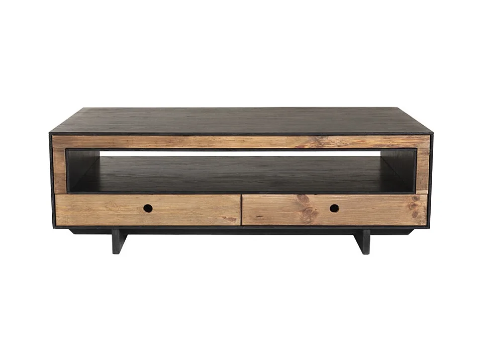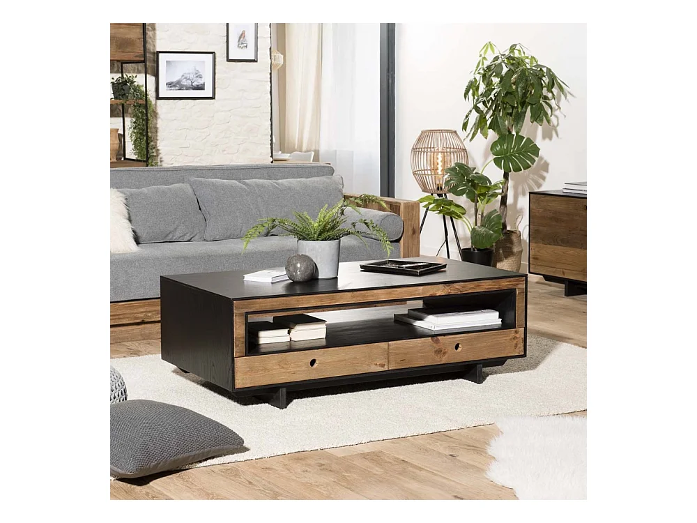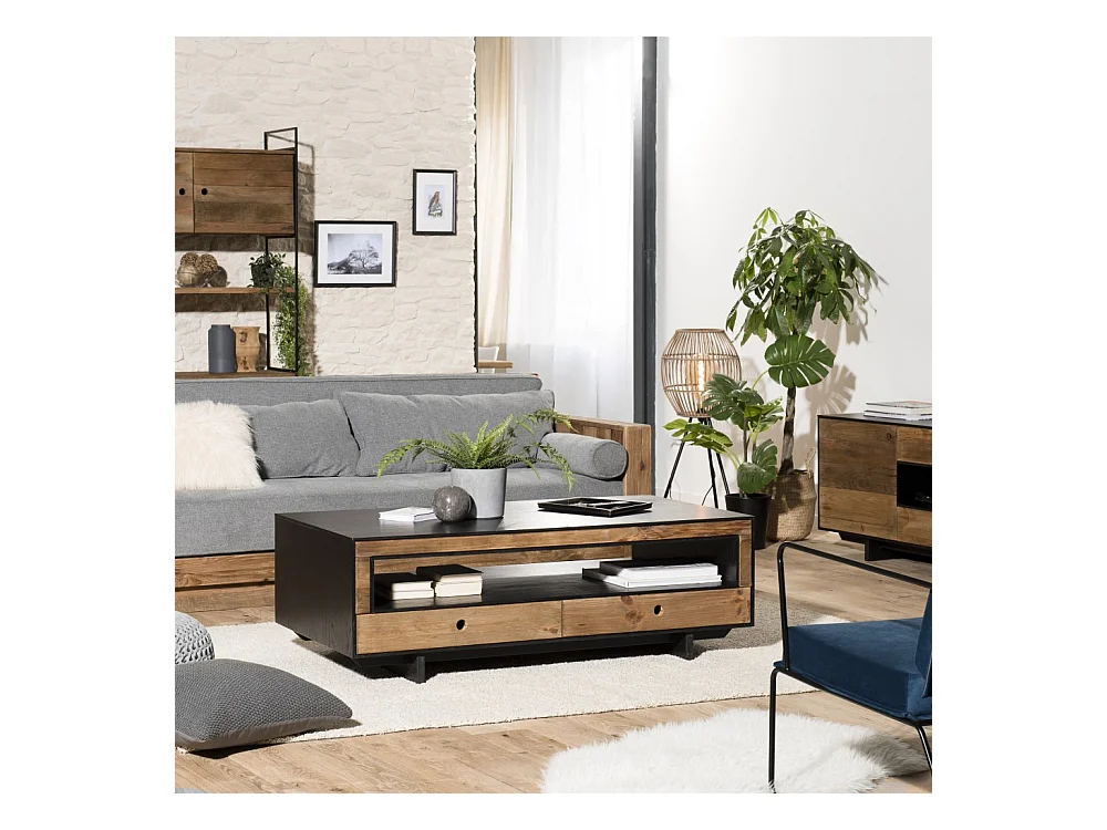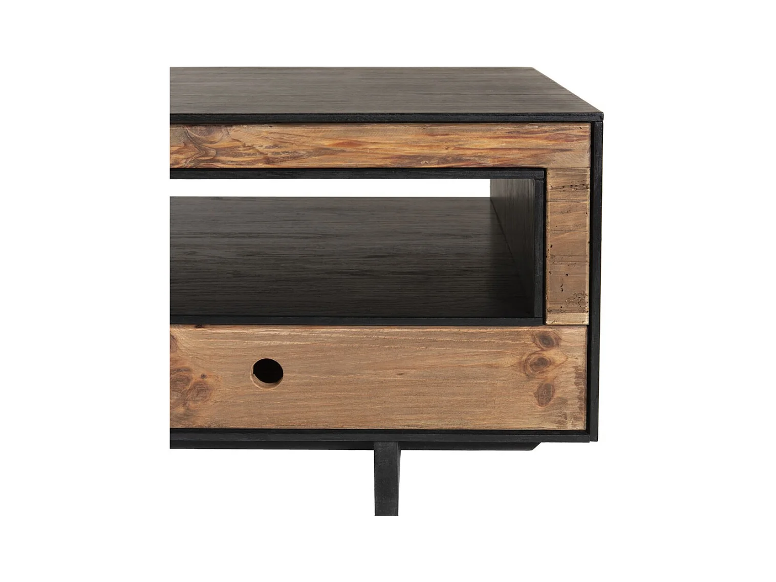 DANDY - Table basse 4 tiroirs 1 niche bois Pin recyclé naturel et noir