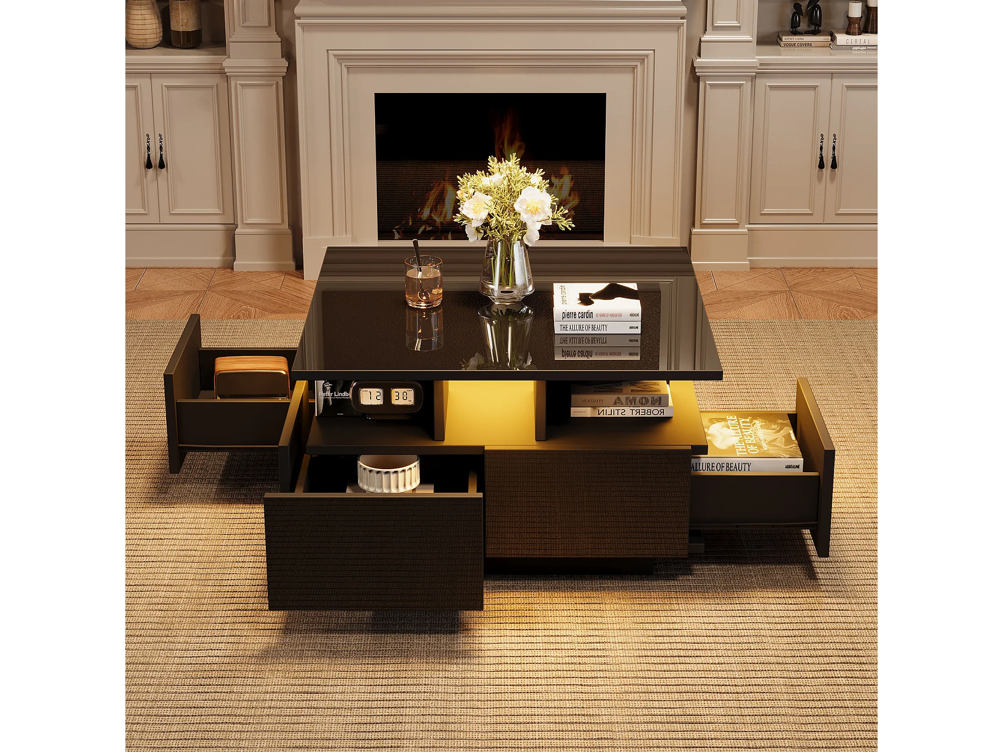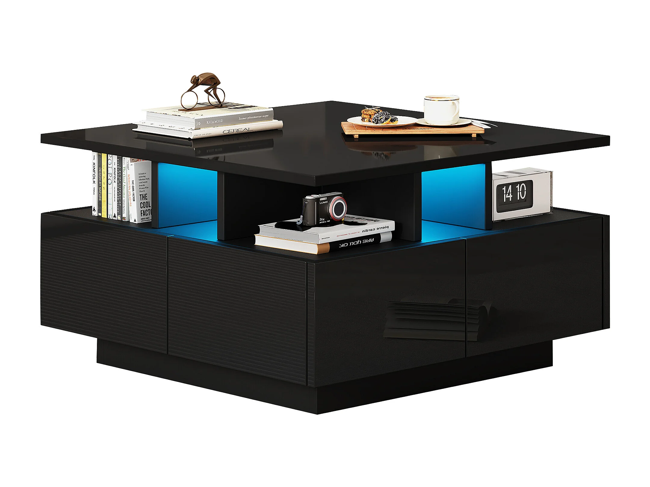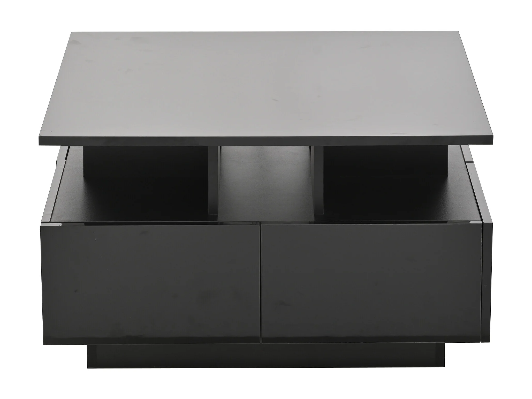 Table basse 70x70x40 cm LED 4 tiroirs design géométrique noir salon contemporain