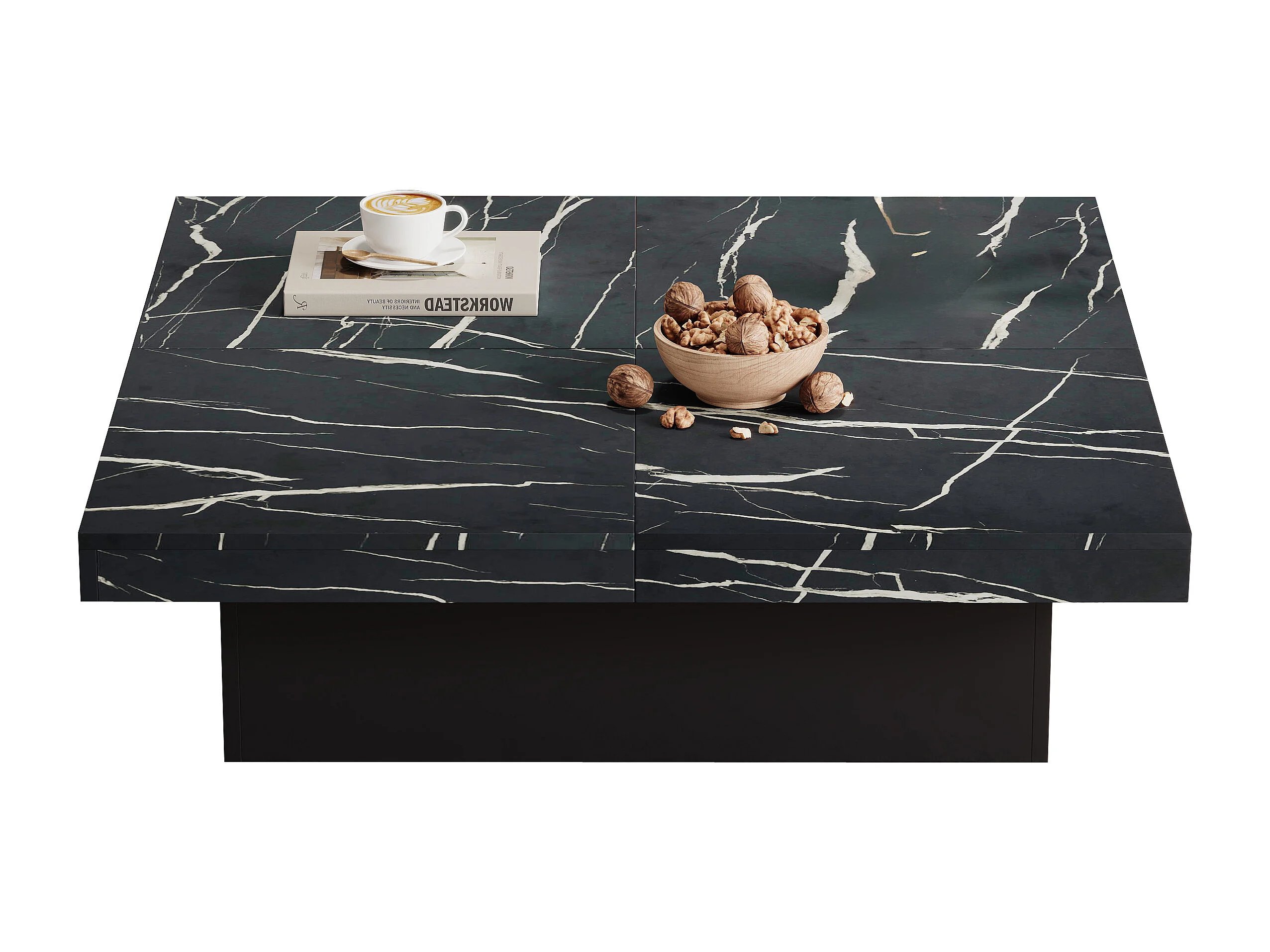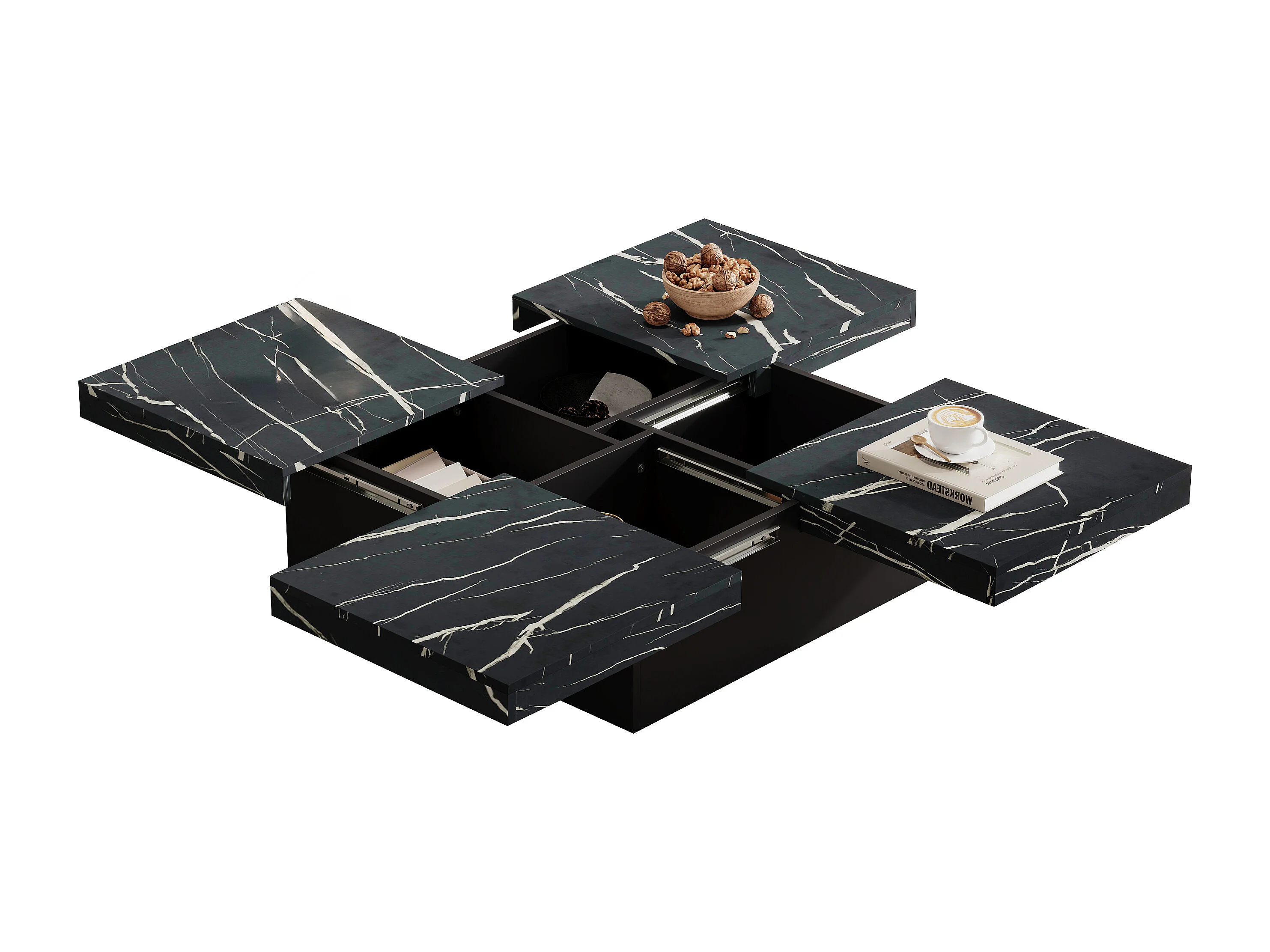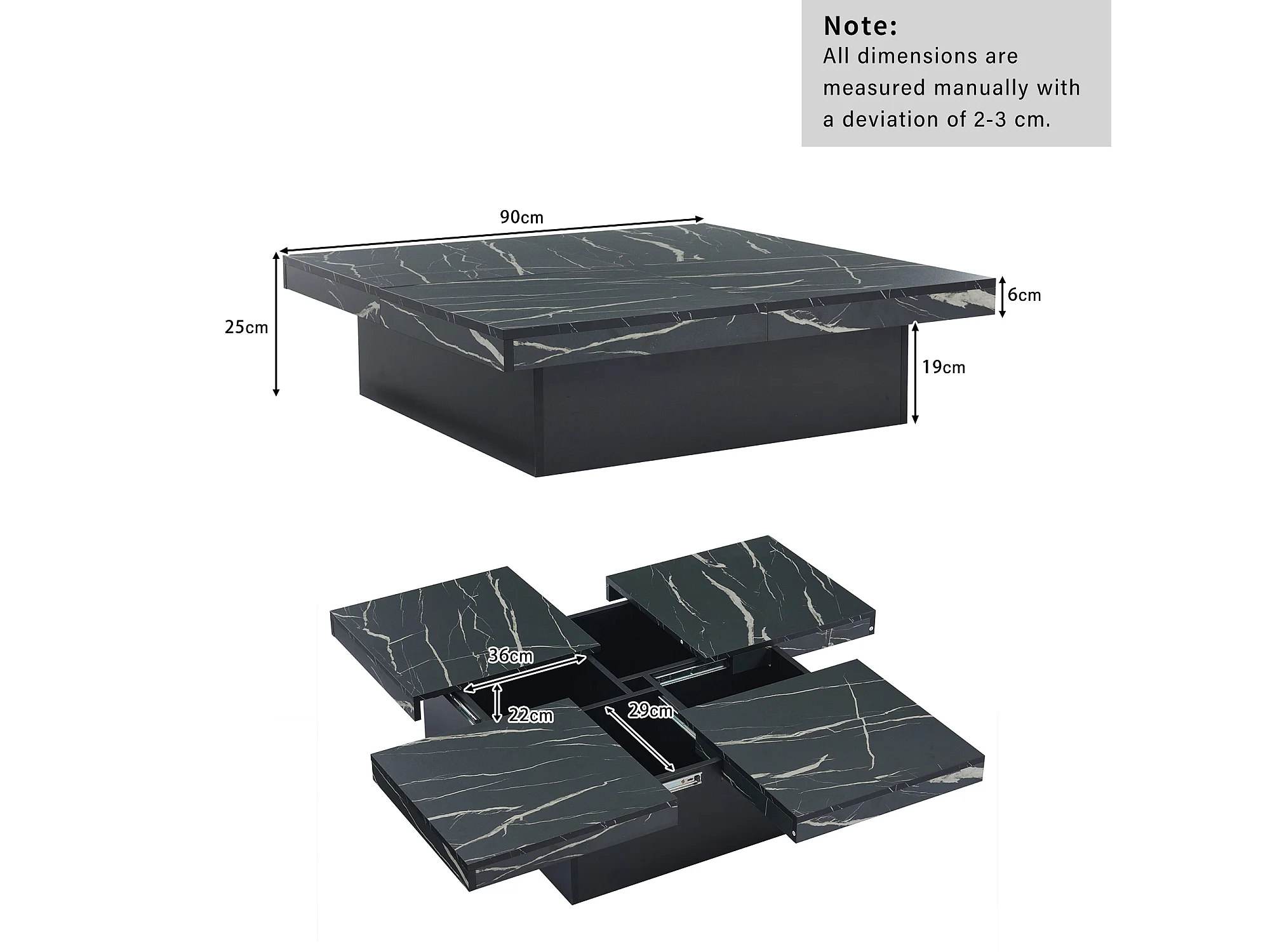 Table basse 90x90x25cm marbre 4 tiroirs plateau coulissant noir pour salon