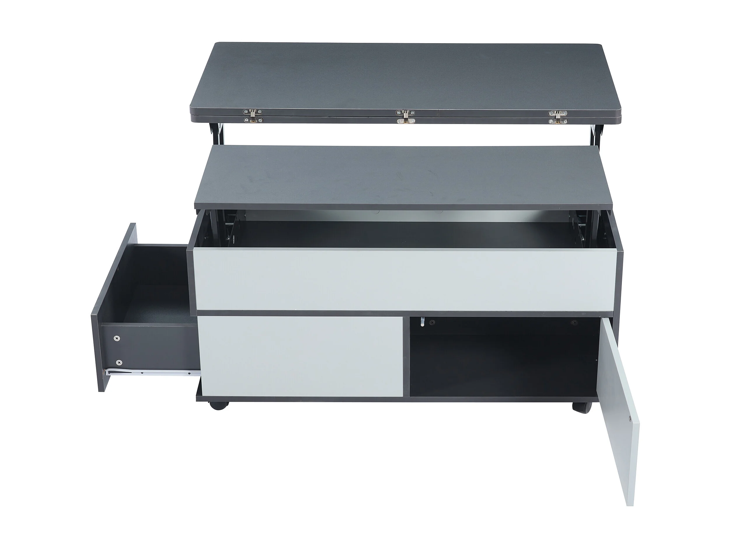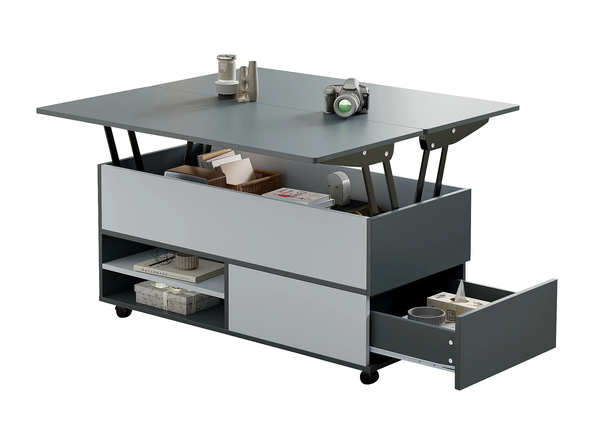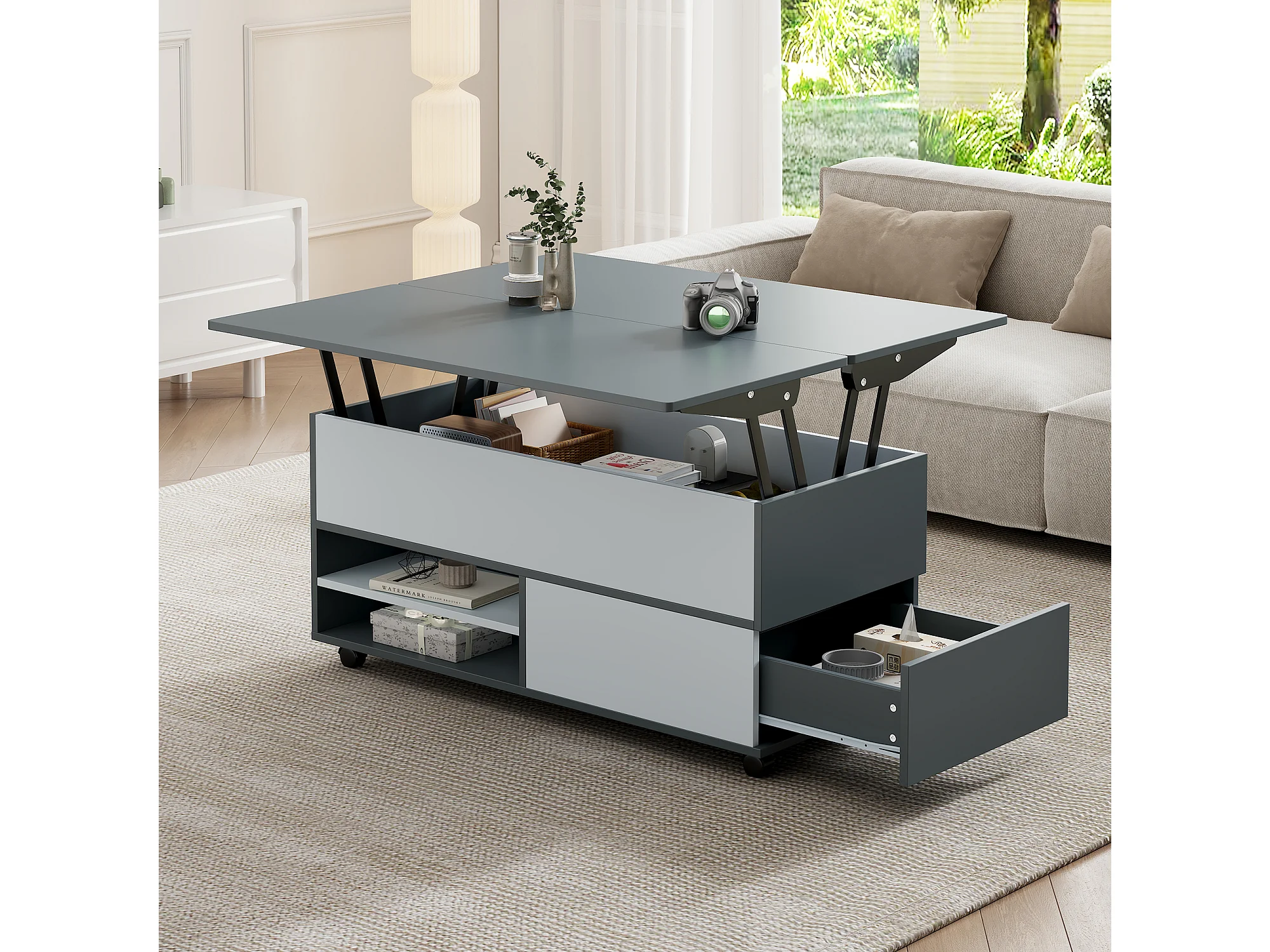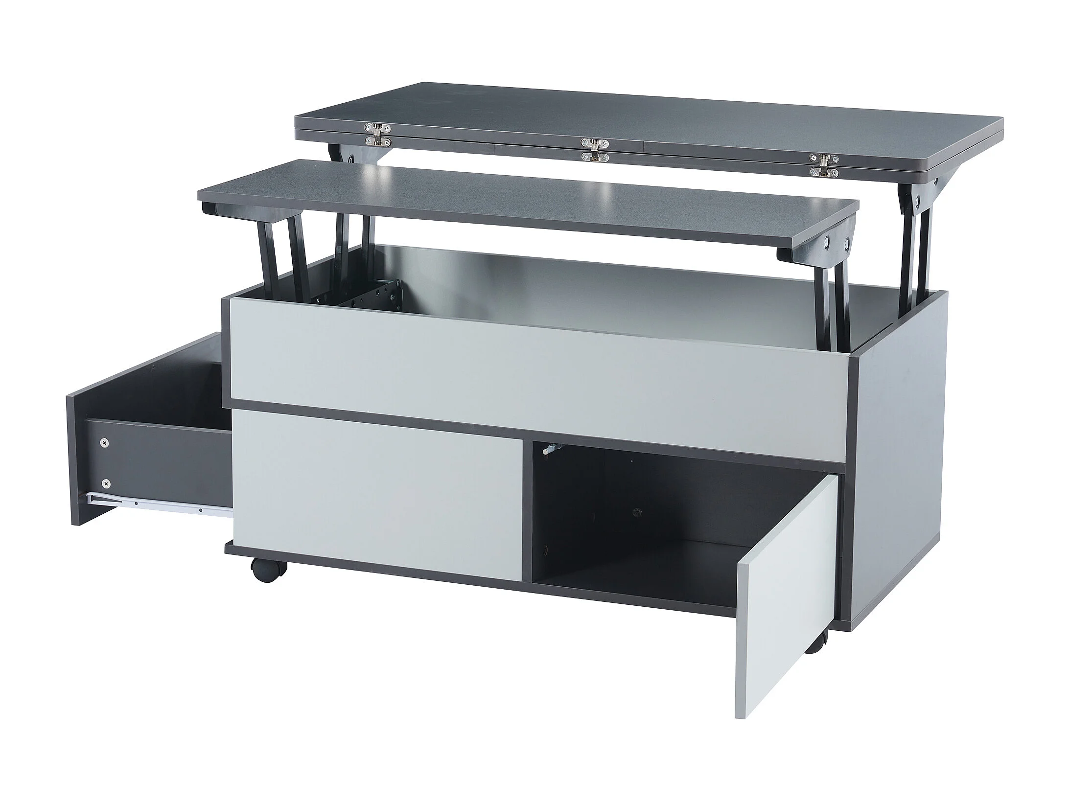 Table basse 100 x 98 x 65 cm meuble salon moderne à roulettes et tiroirs bois gris et blanc