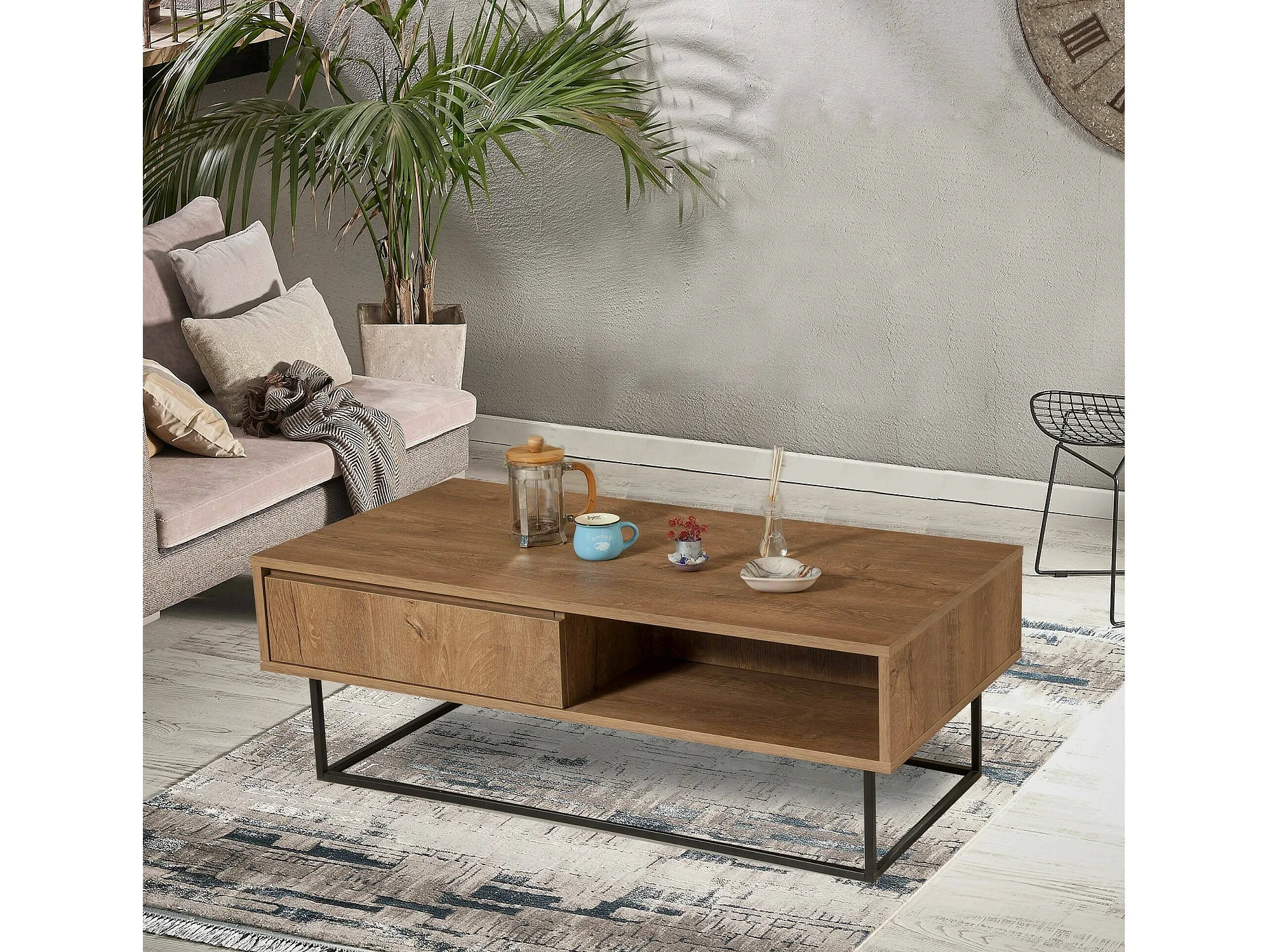 Table basse Algenib, Table basse, Porte-revues pour canapé, Etagère de salon, 120x60h43 cm, Noyer et Noir