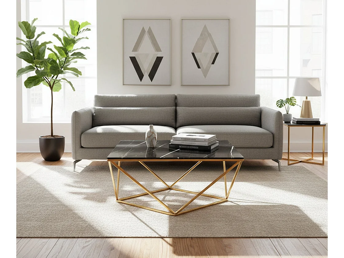 Table Basse ALINA Carrée Plateau Verre Trempé Marbré Noir Pieds Gold 80x80x45cm