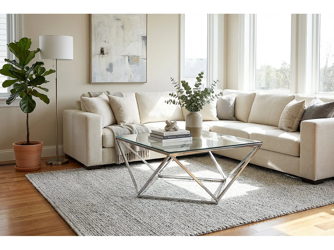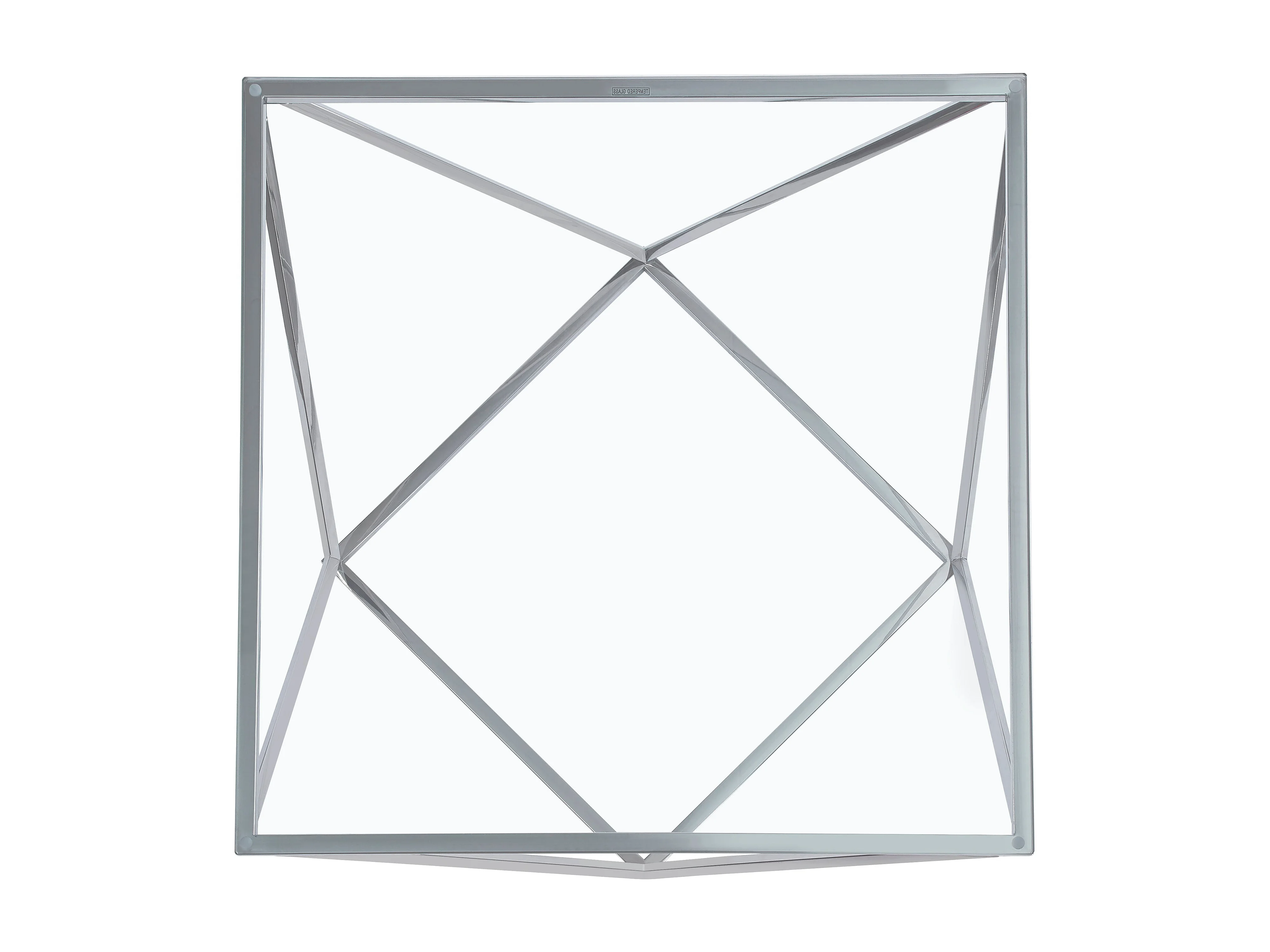 Table Basse Carrée Plateau Verre Trempé Transparent Pieds Chrome 80x80x45cm