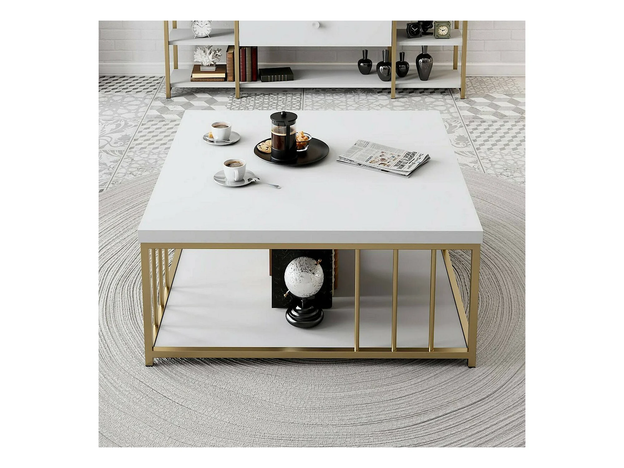 Table basse Ankaa, Table basse, Porte-revues pour canapé, Etagère de salon, 90x39h40 cm, Blanc et Or