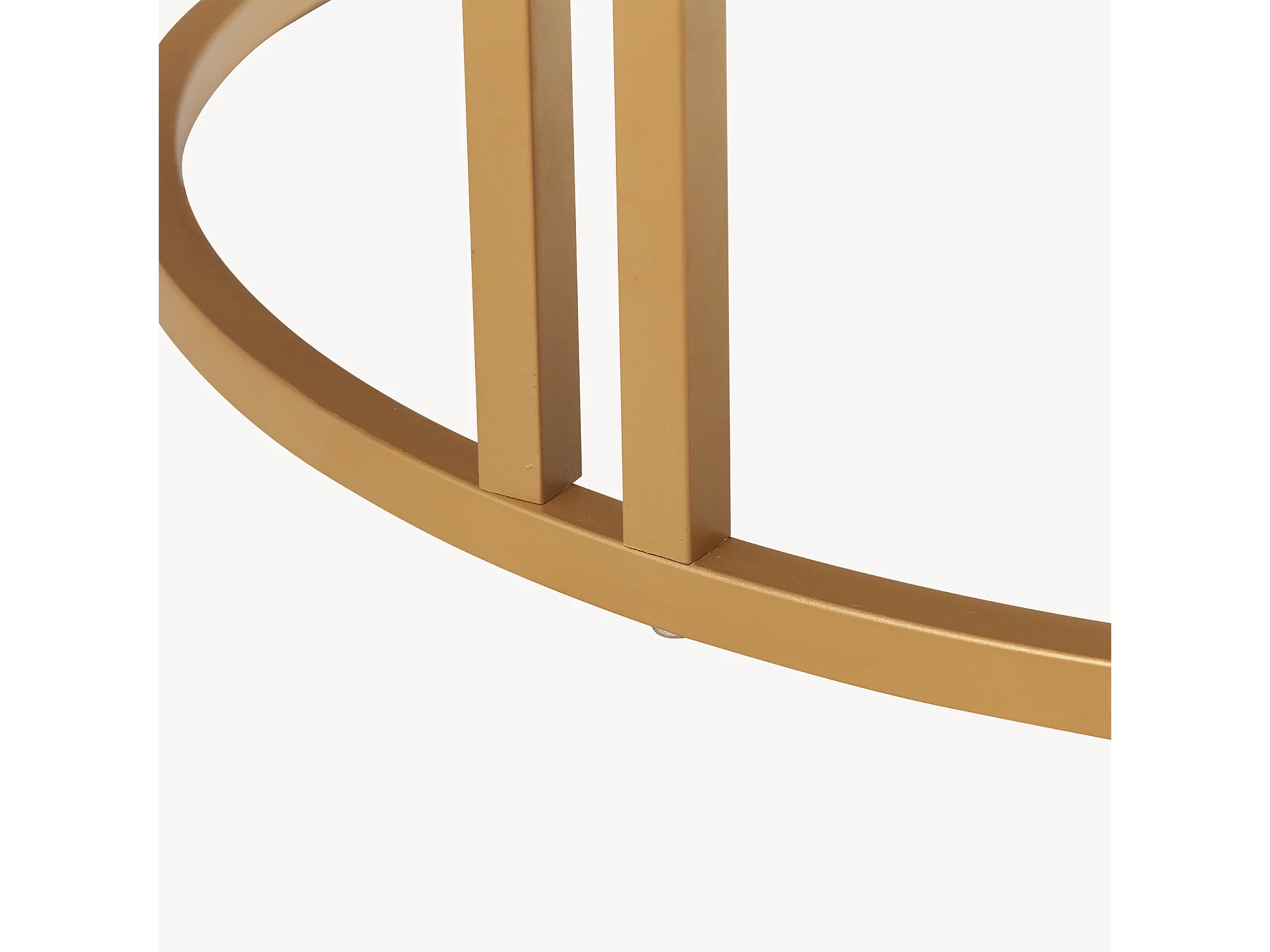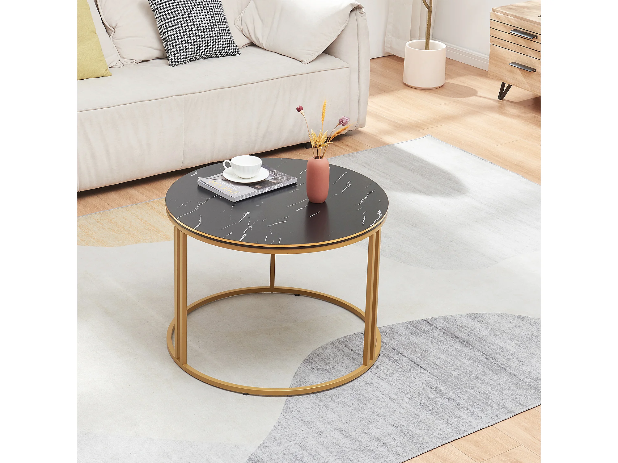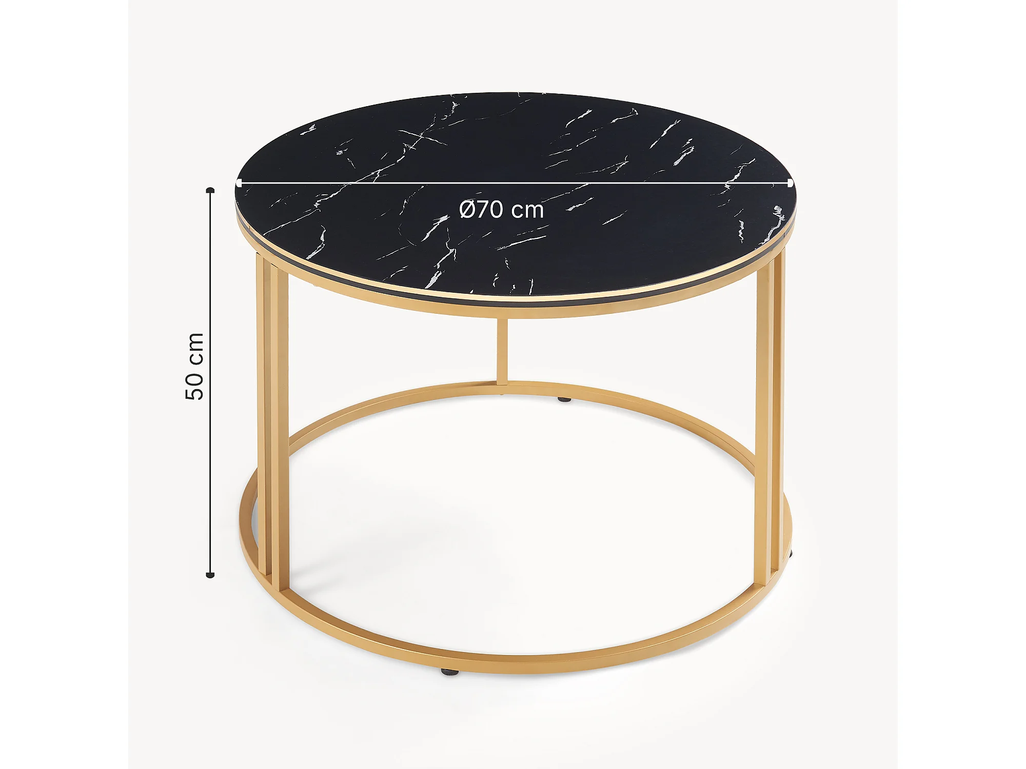 Table basse nesting ronde moderne, plateau marbré brillant, MDF, cadre doré, blanc et noir (70x70x45cm)
