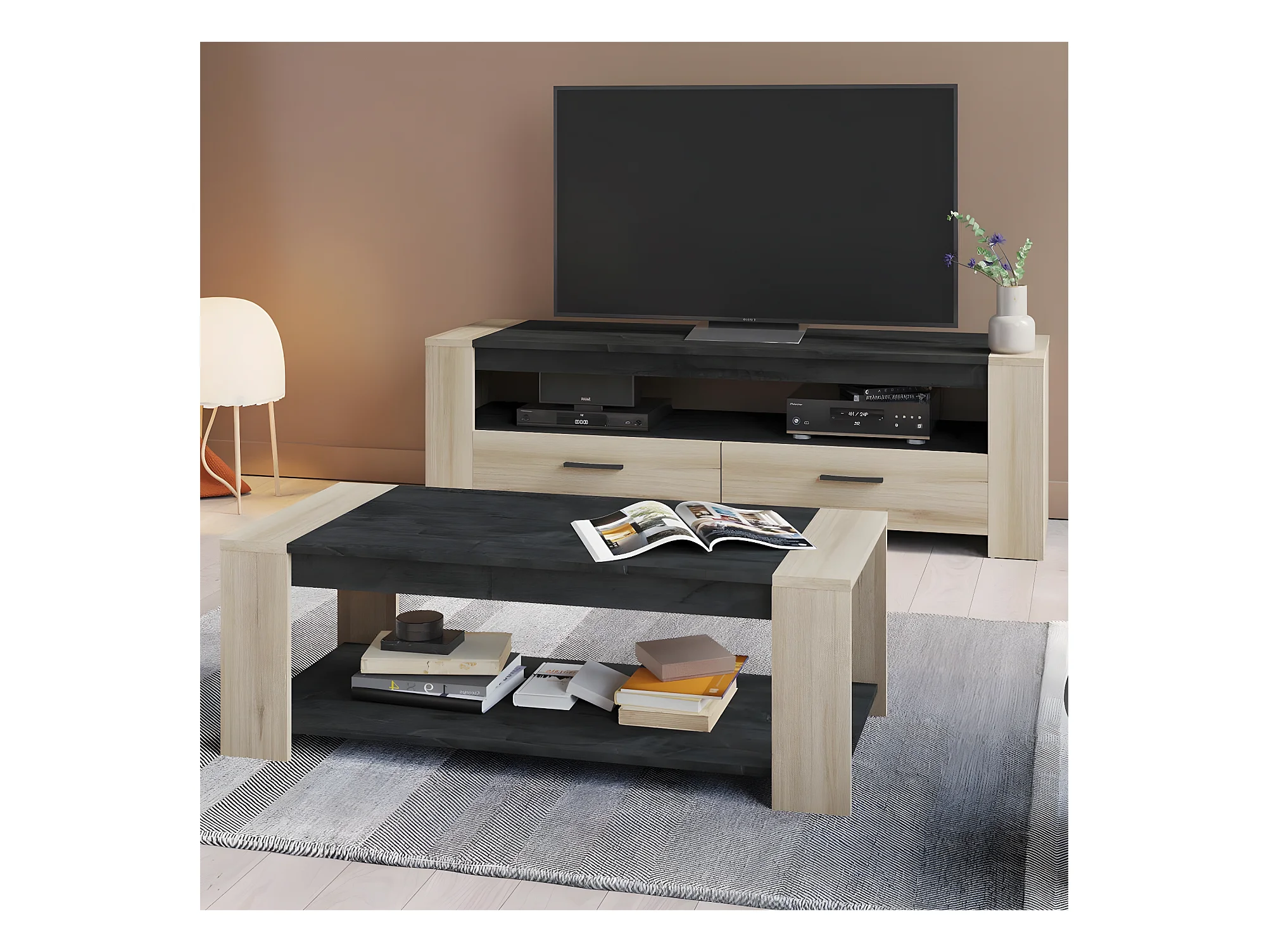 Table basse 1 tiroir et 1 niche décor chêne hamilton et noir - L110,4 cm
