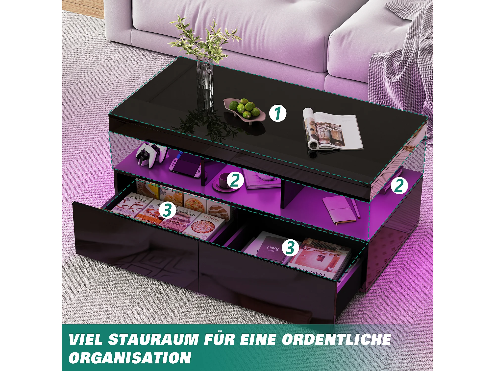 Table basse avec éclairage LED - table de salon avec 2 tiroirs de rangement et une étagère ouverte - 104×53×46 cm