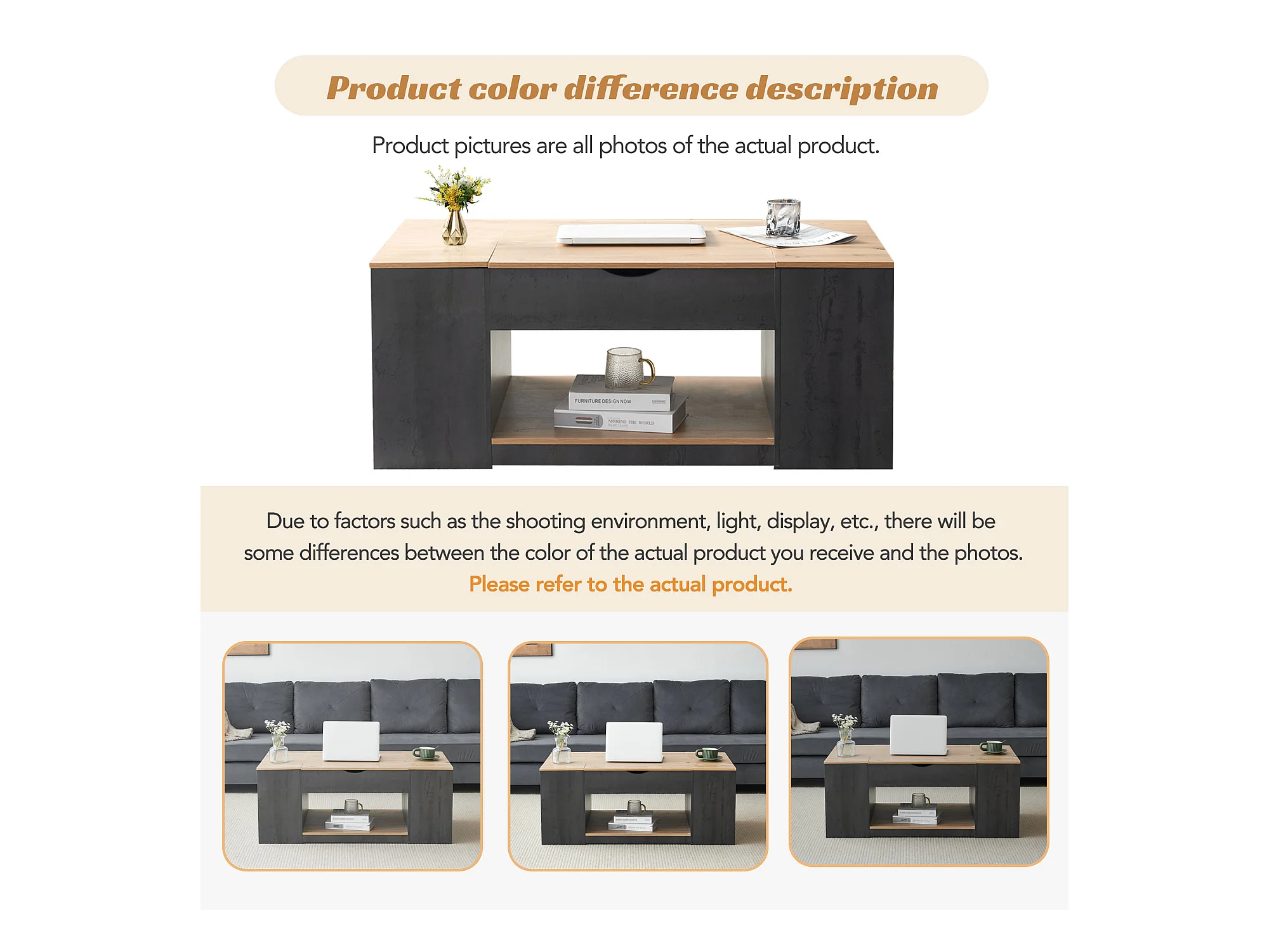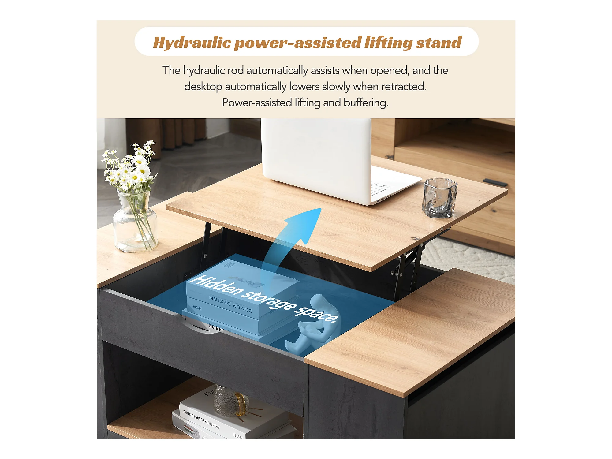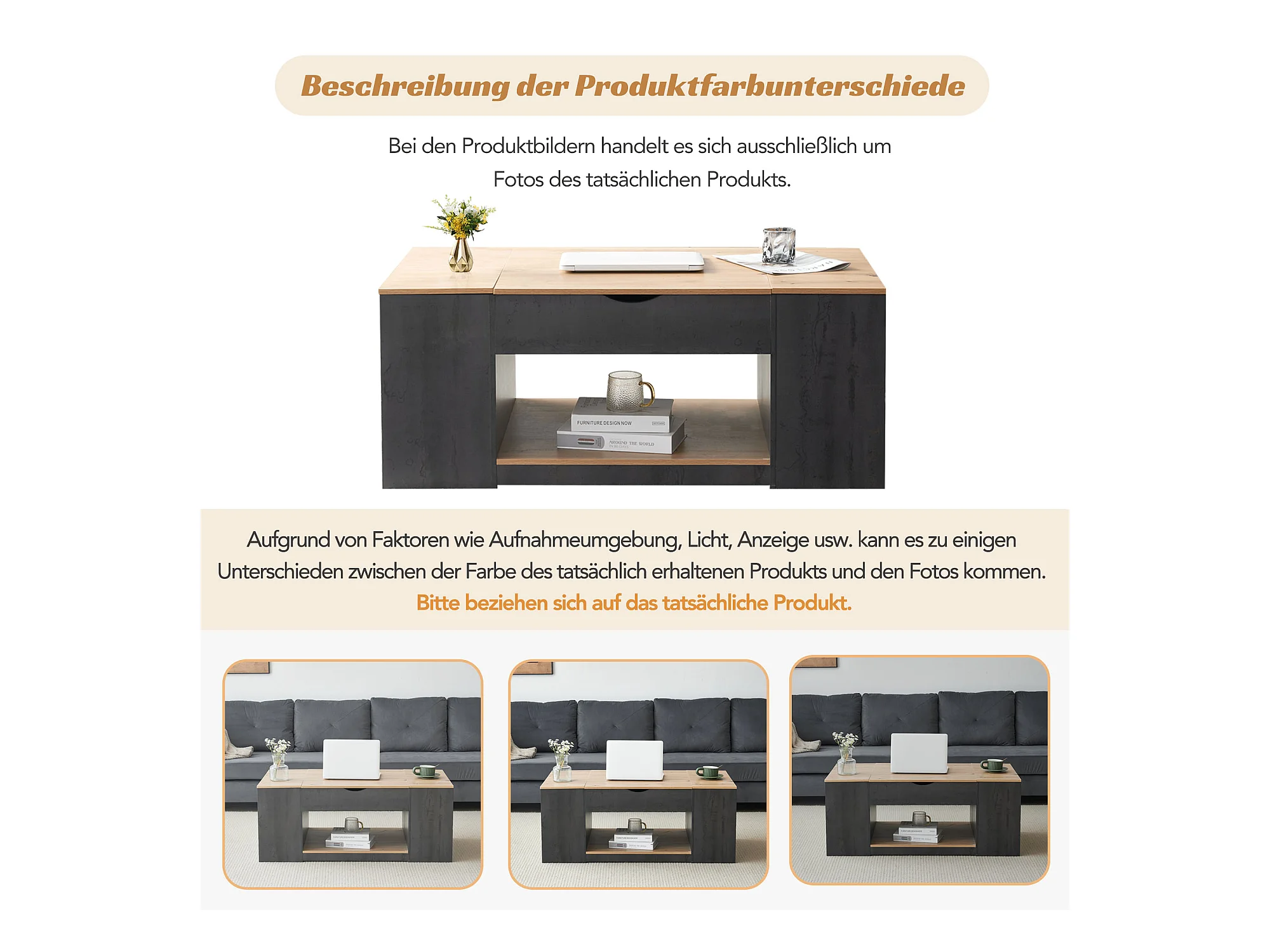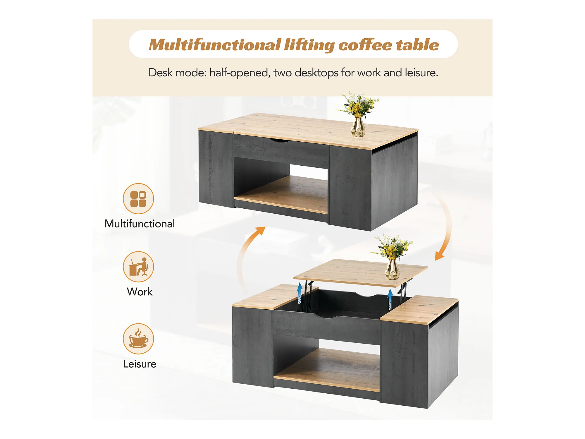 Table Basse avec Fonction de Levage – Design Moderne en Gris avec Espace de Rangement et Plateau en Bois