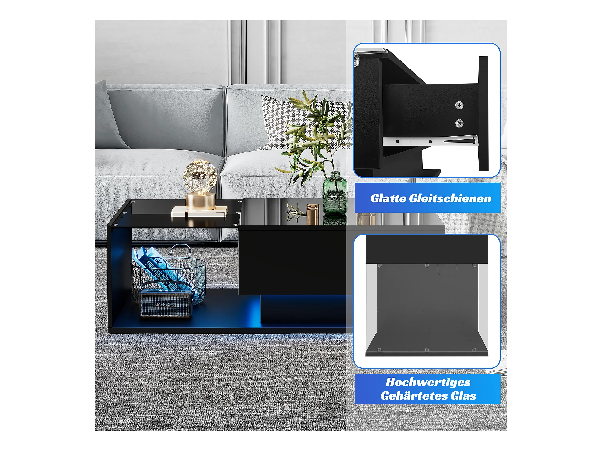 Table basse avec LED - 2 tiroirs et 2 compartiments - style moderne - Noir
