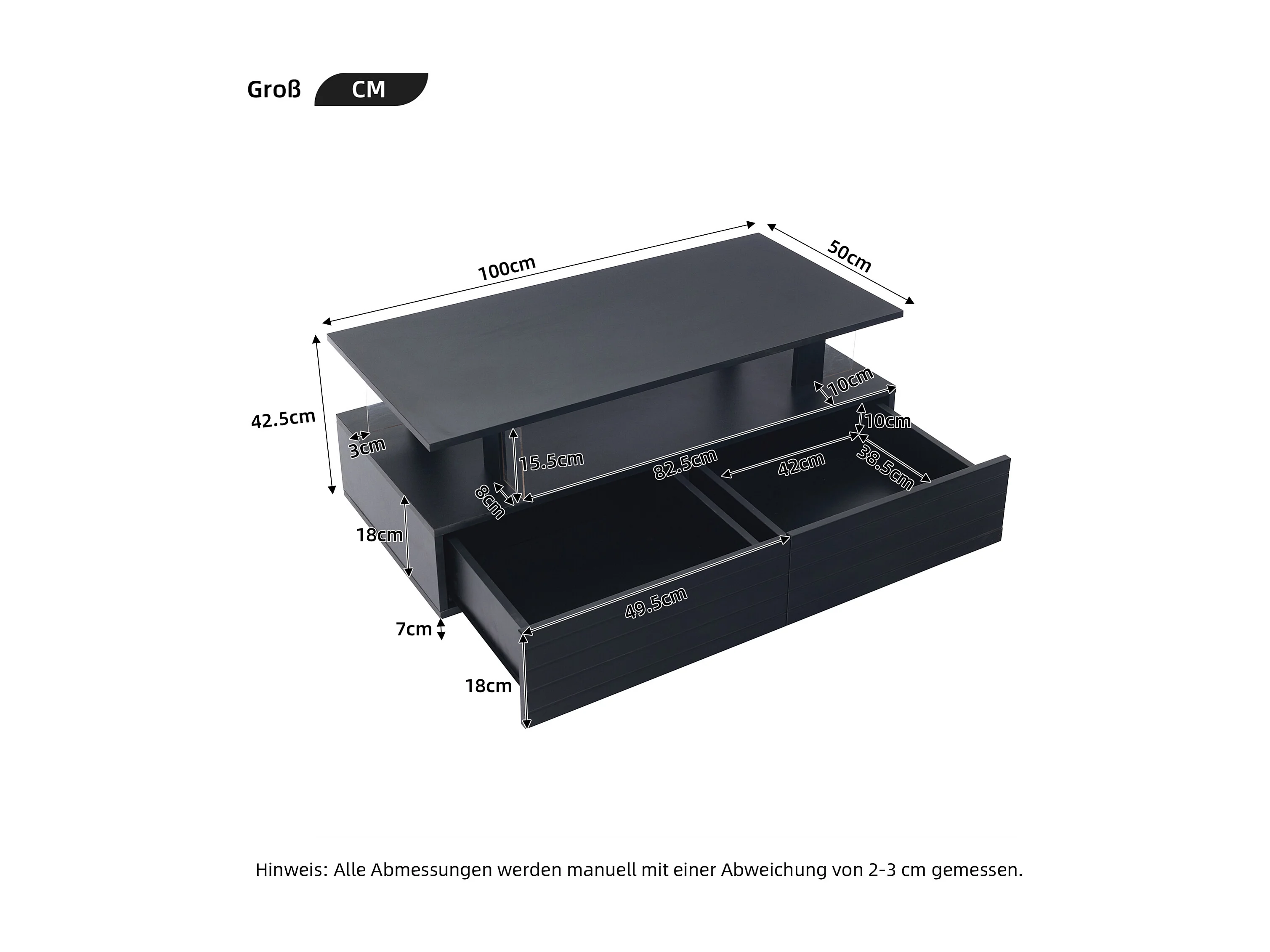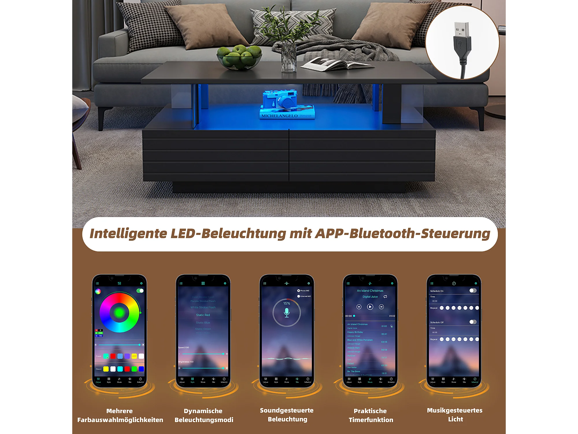 Table Basse avec LED, Fonction de Rangement, Table Basse rectangulaire à Double Couche, Noir