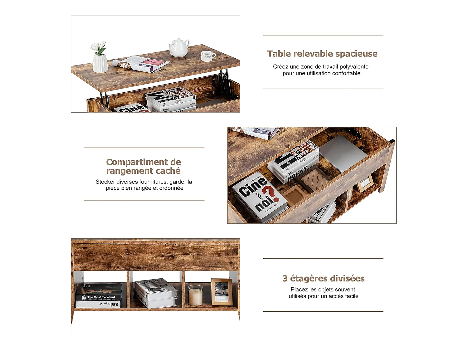 Table Basse avec Plateau Relevable Noir 105 x 52 x 49 CM avec Trois Compartiments pour Rangement Design Contemporain, Naturel