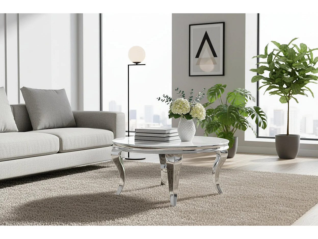 Table Basse BAROQUE Ronde Plateau Verre Trempé Blanc Structure Chrome D80x45cm
