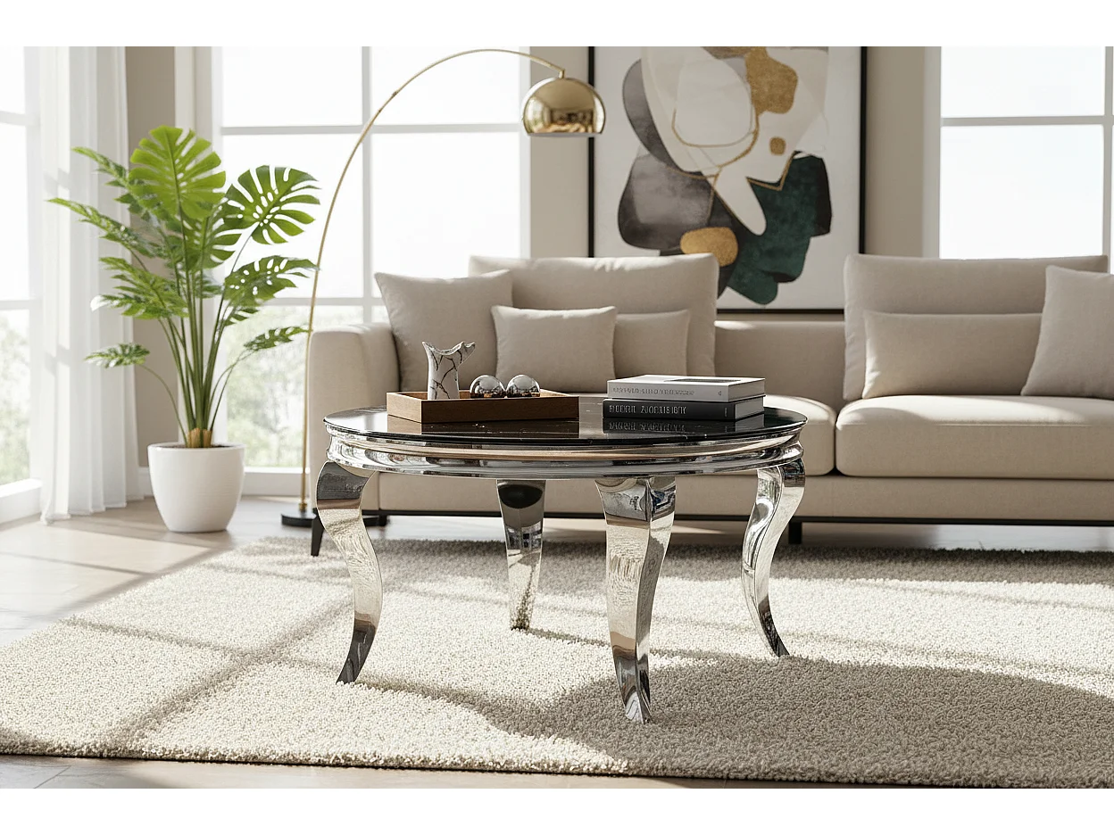Table Basse BAROQUE Ronde Plateau Verre Trempé Marbré Noir Structure Chrome D80x45cm