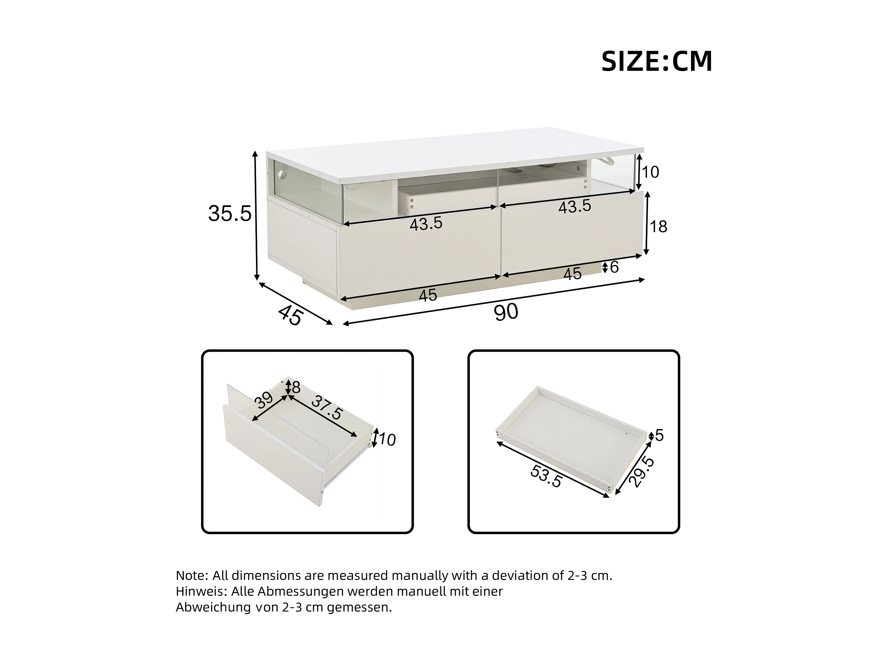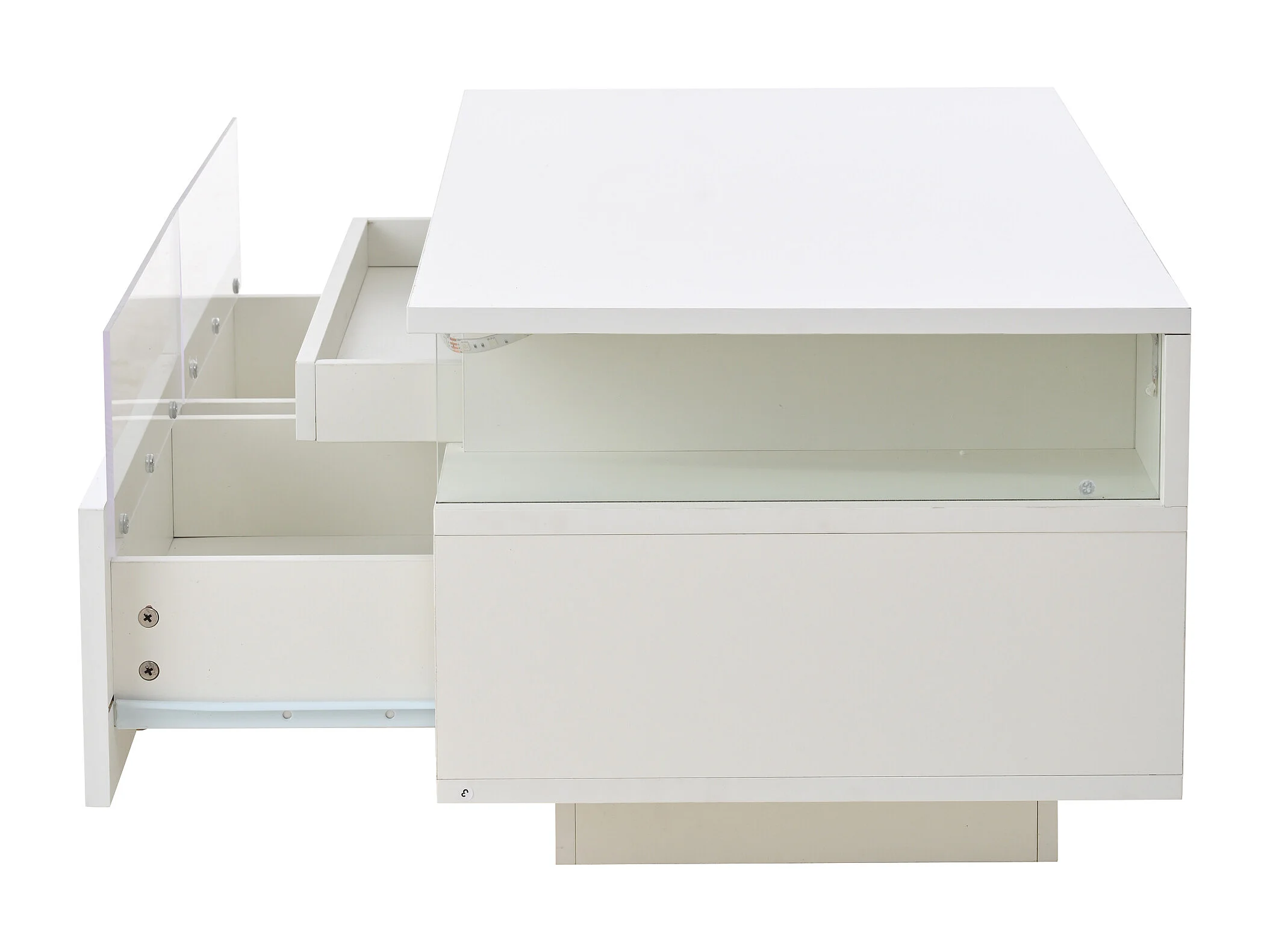Table basse blanche avec 2 tiroirs, éclairage LED et plateau amovible 90x45x35,5cm