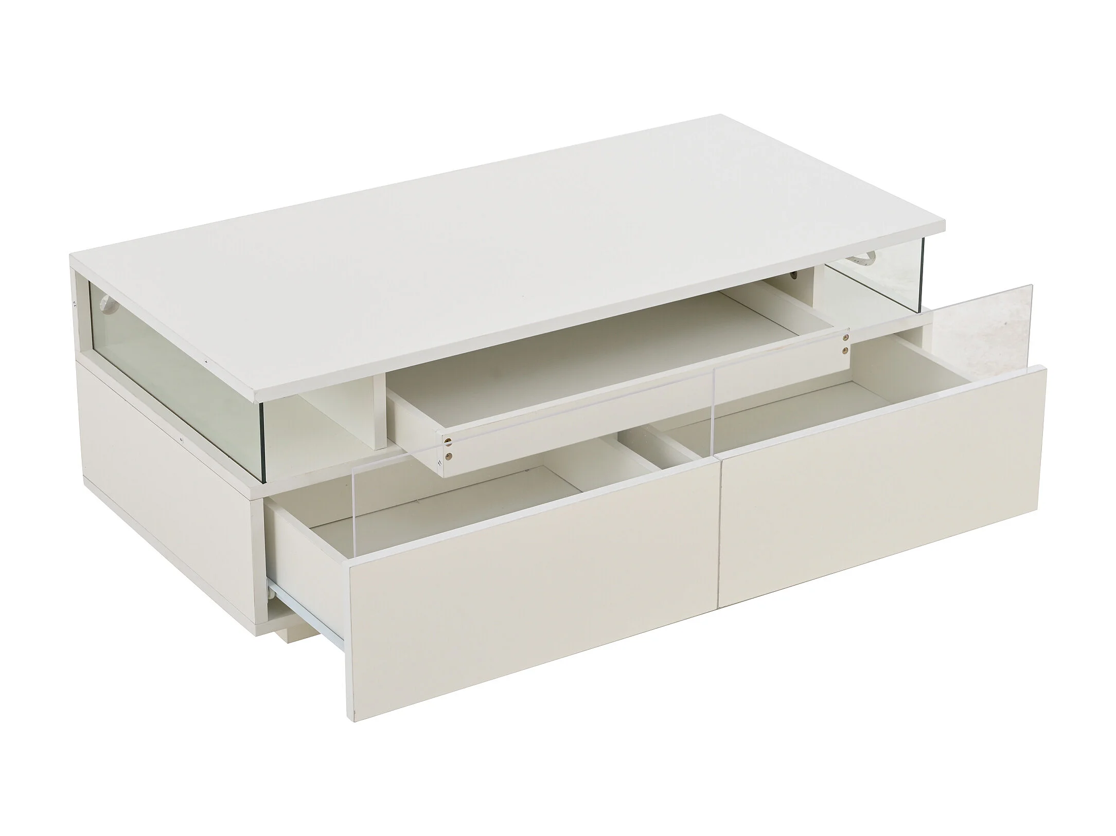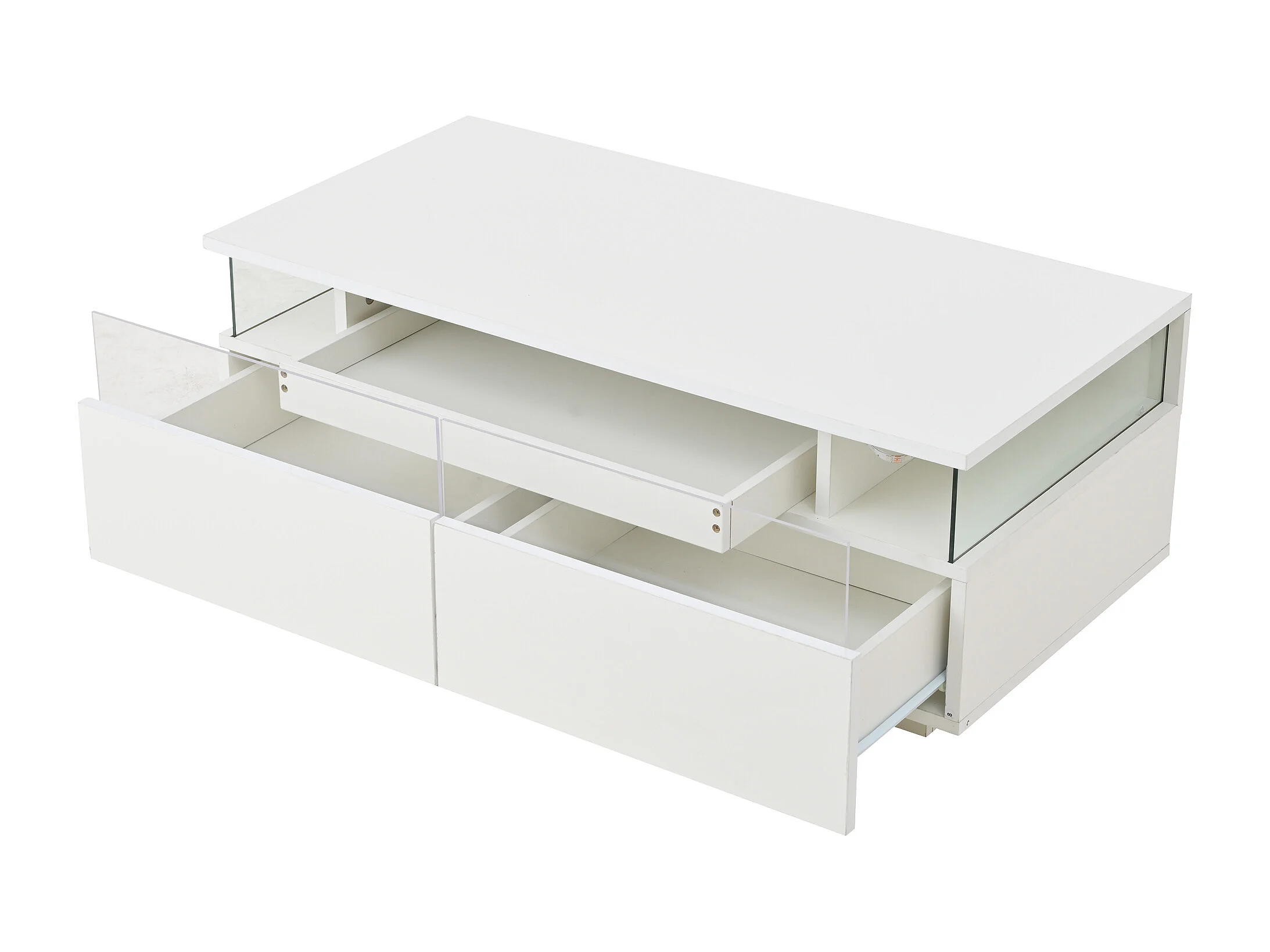 Table basse blanche avec 2 tiroirs, éclairage LED et plateau en verre 105x50x35cm