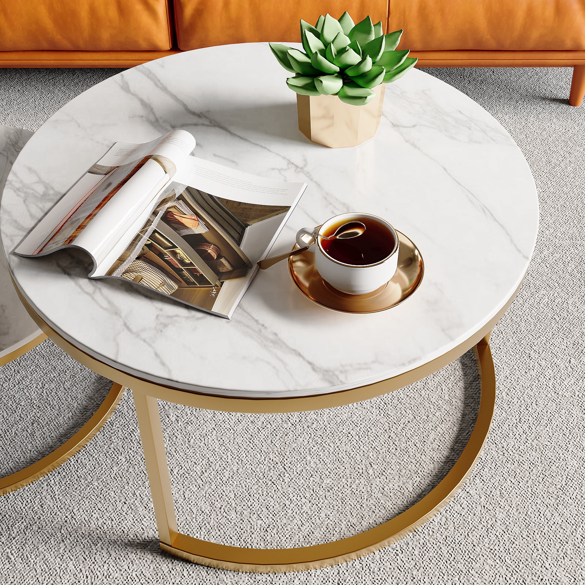 Table Basse Blanche avec Cadre doré, Coffee Table 2 pièces, Table Basse Ronde Blanche Moderne, Table Gigogne Ronde avec Effet marbre Blanc