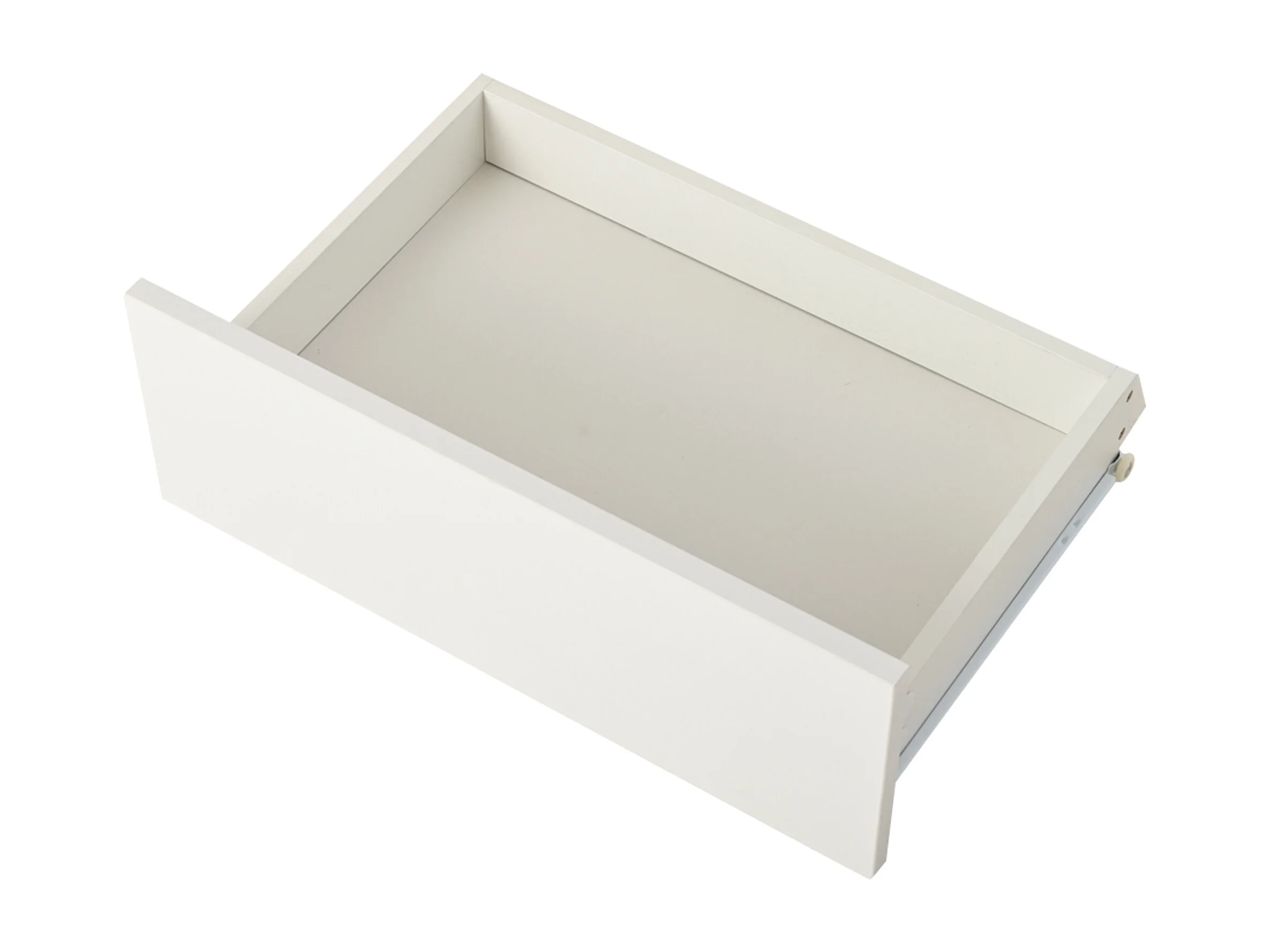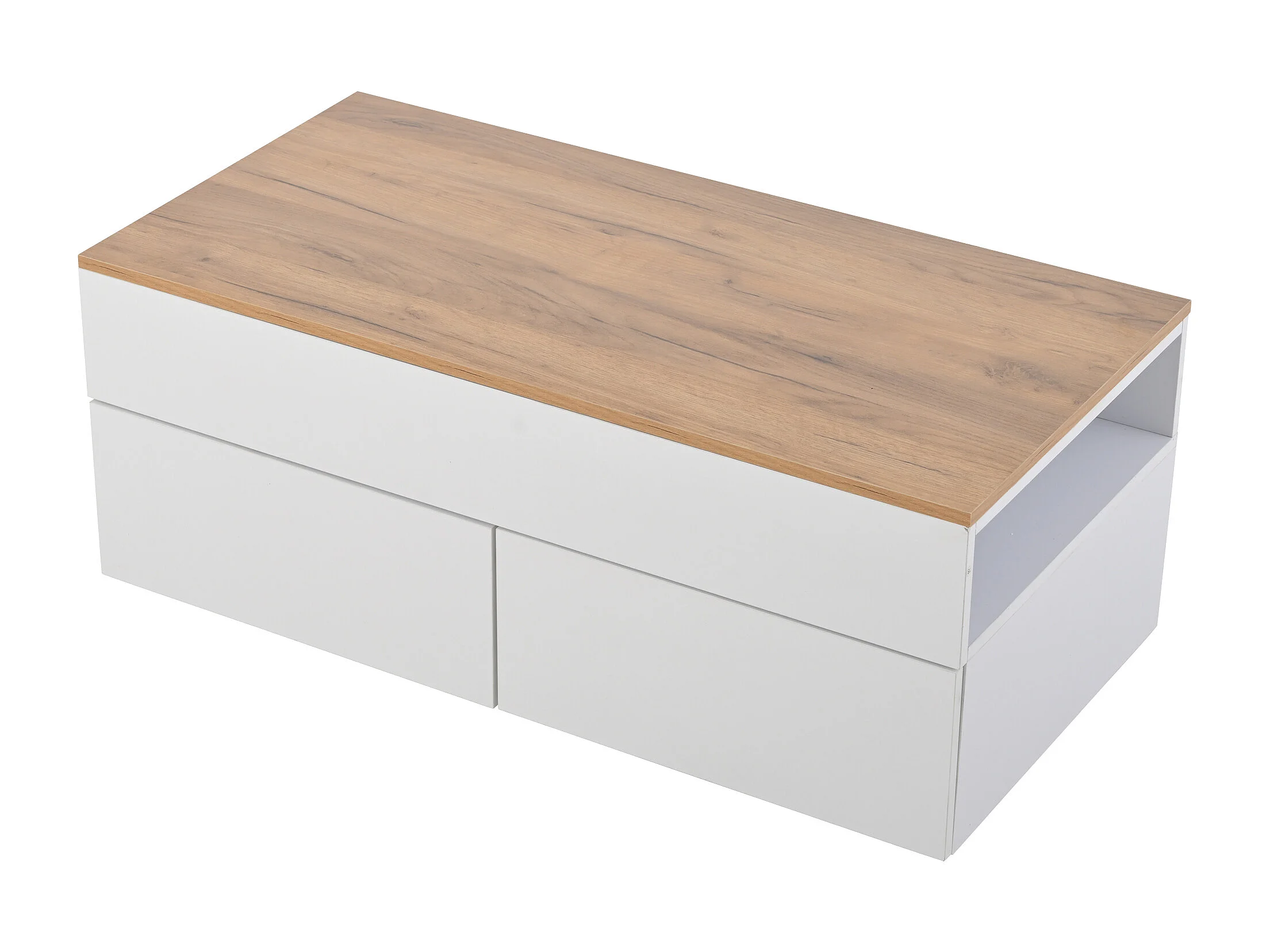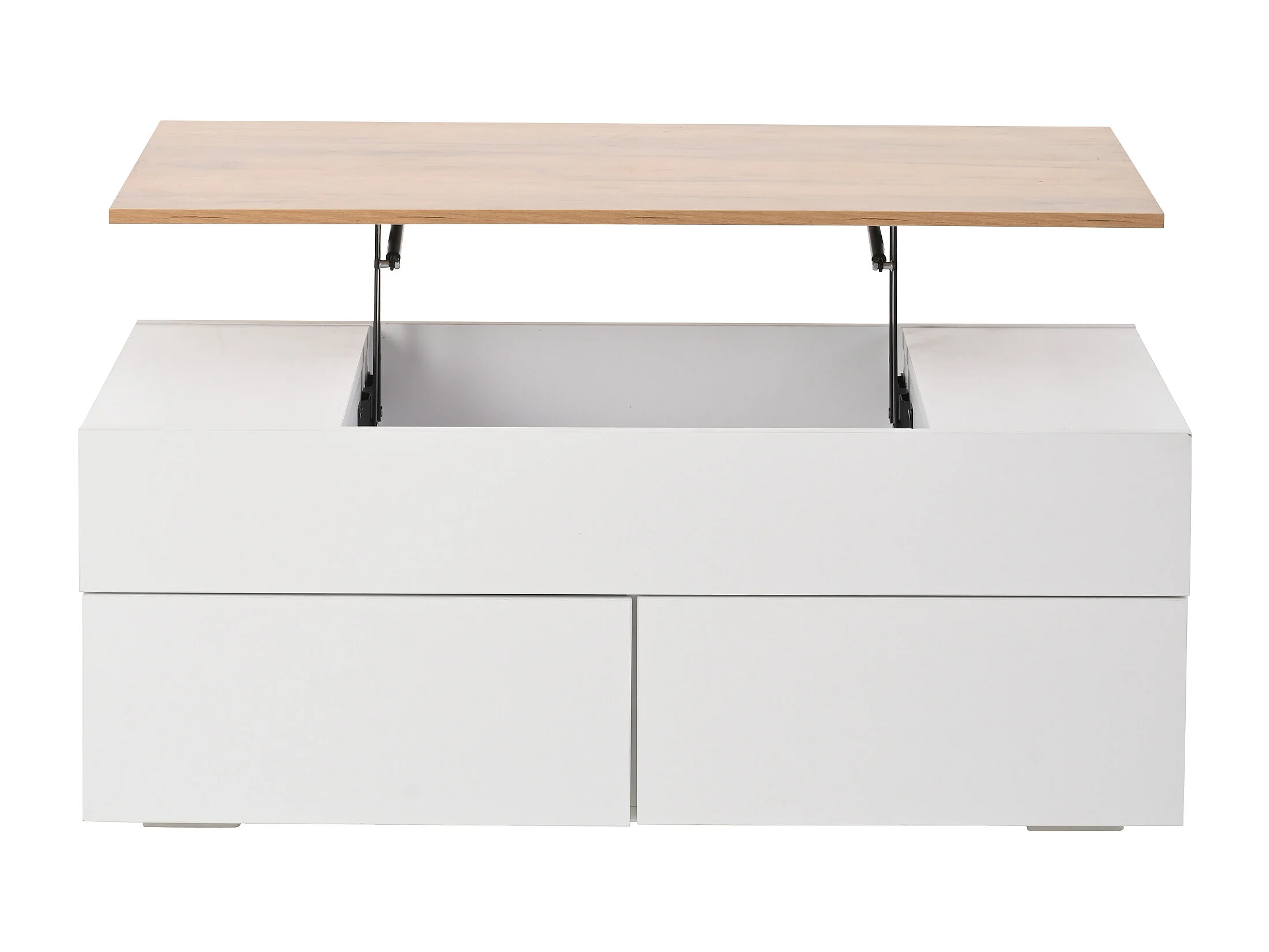 Table basse blanche avec plateau relevable en grain de bois et 2 tiroirs de rangement