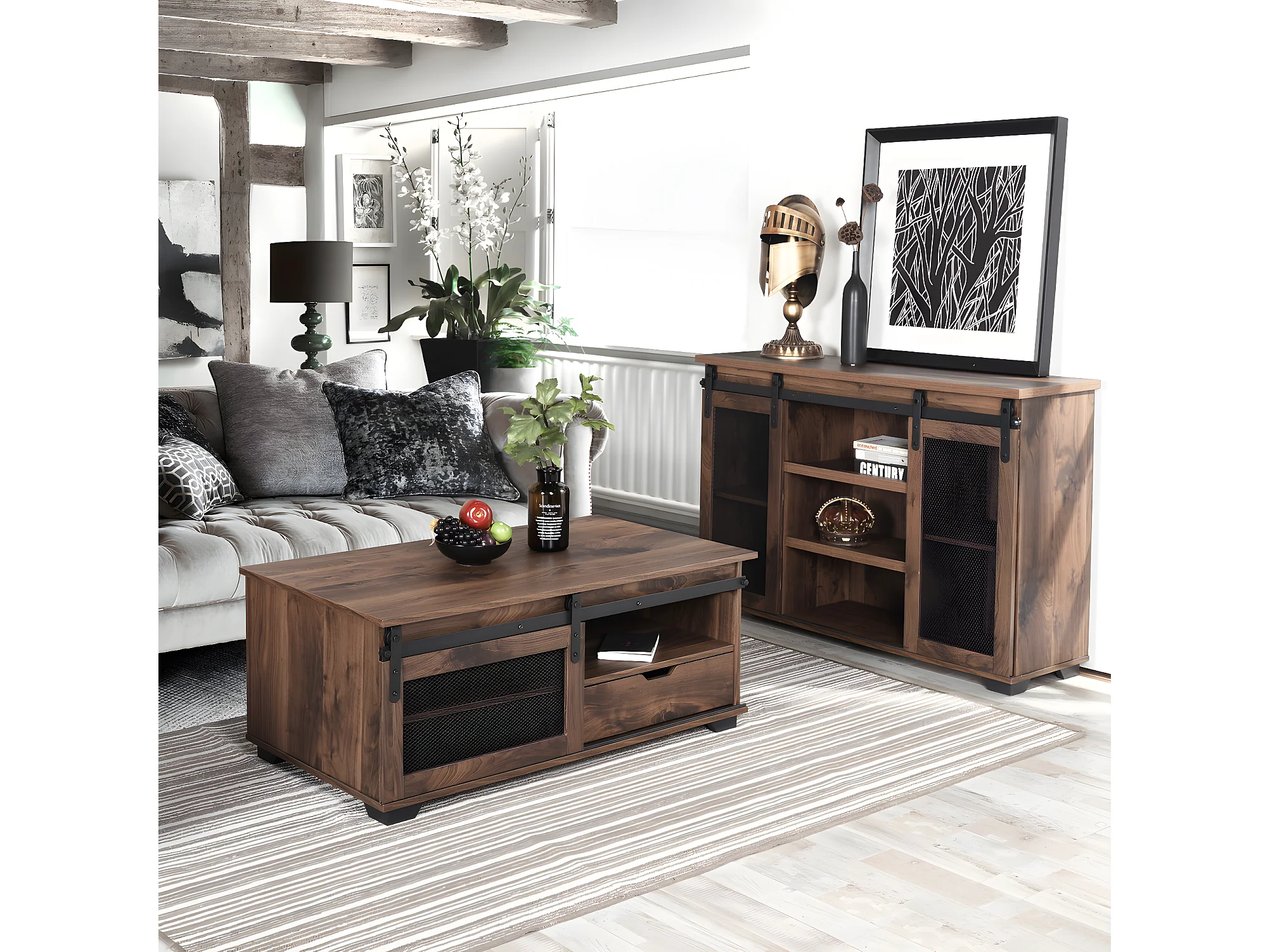 Table basse bois noyer avec 1 tiroir et 3 niches NEWBARN