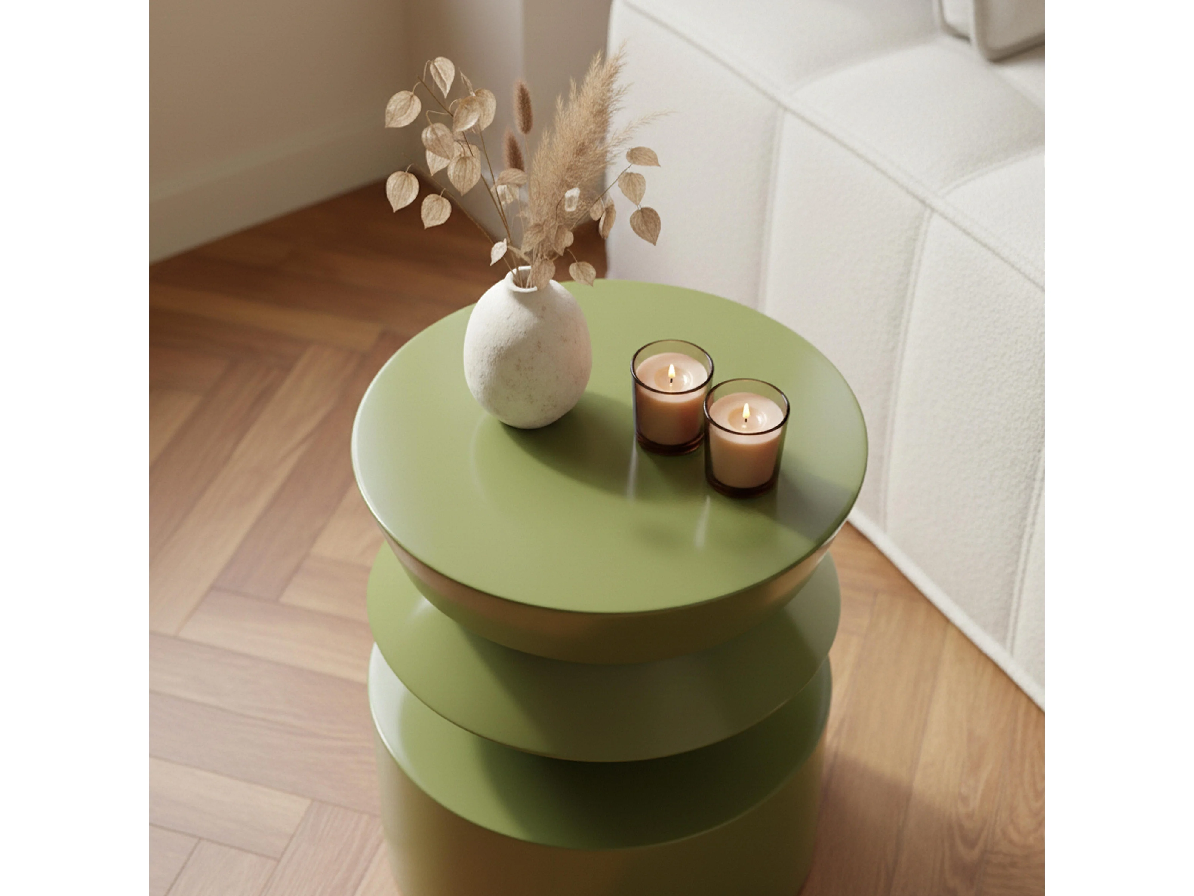 Table basse bout de canapé effet laqué vert olive diam 40 cm