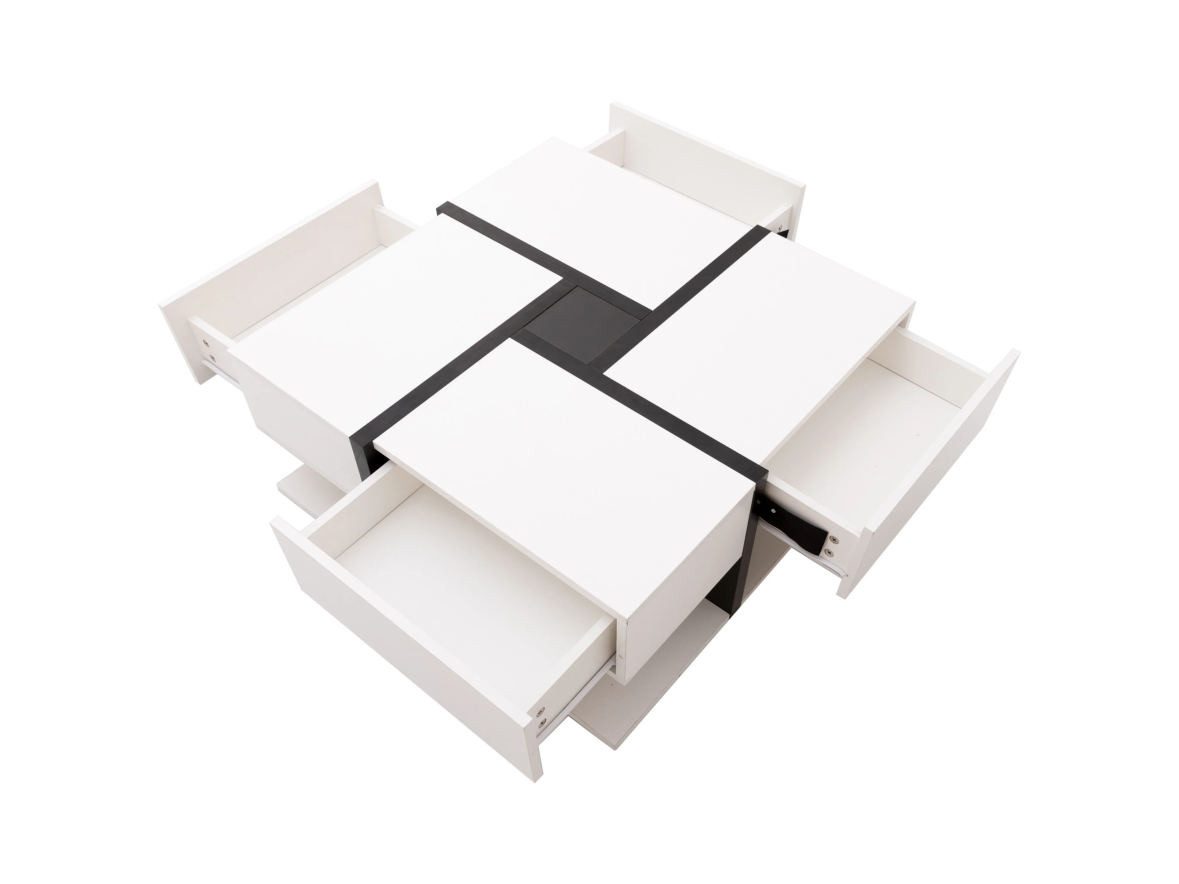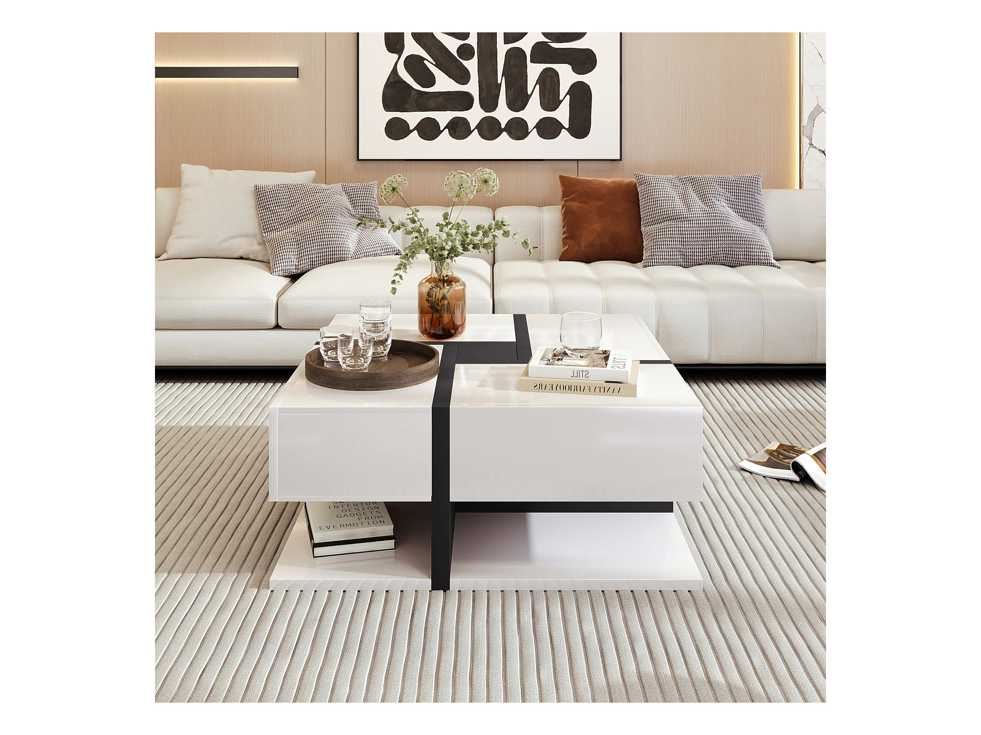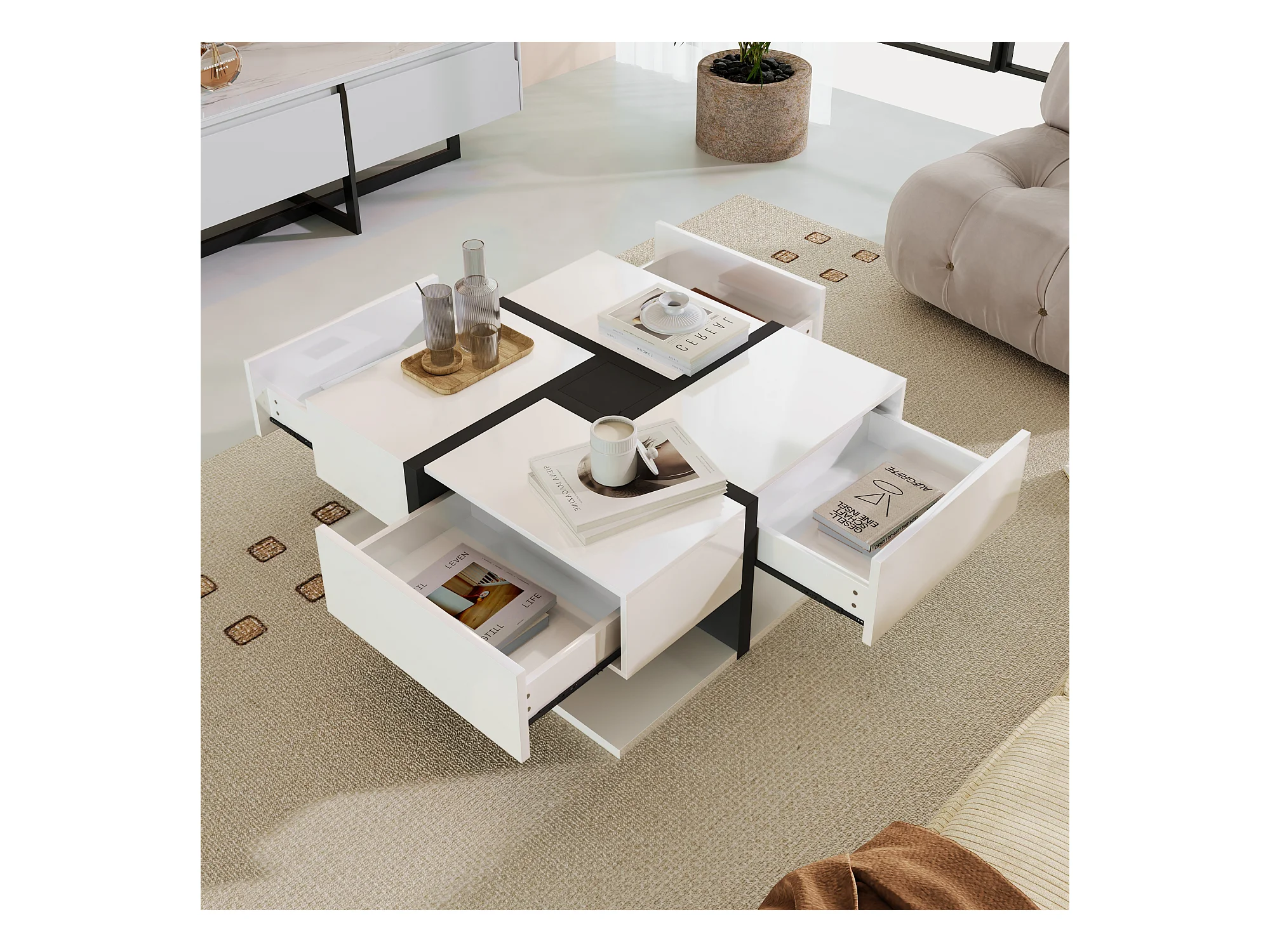 Table basse brillante 78x78x36 cm avec 4 tiroirs, design moderne à lignes uniques, grand espace de rangement inférieur