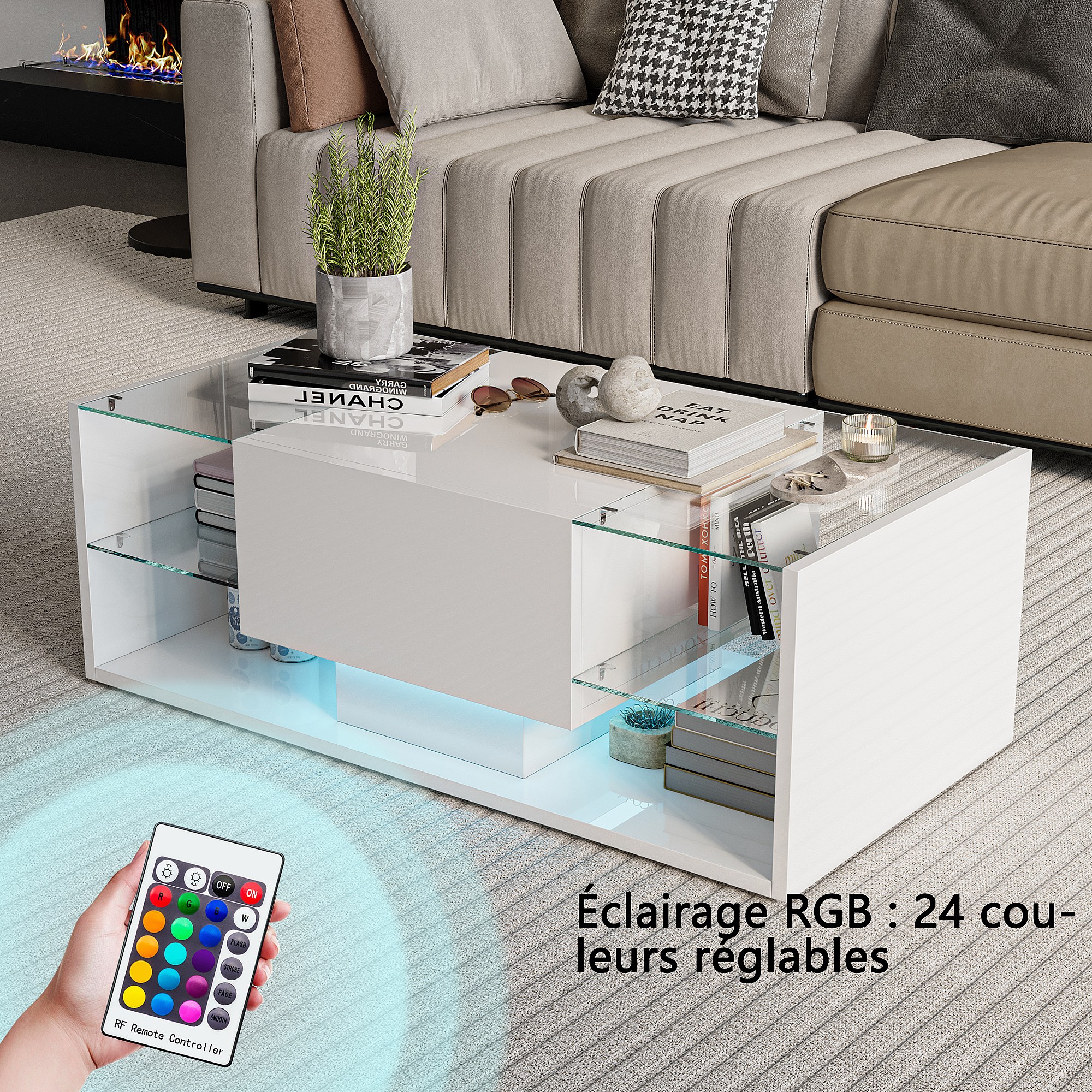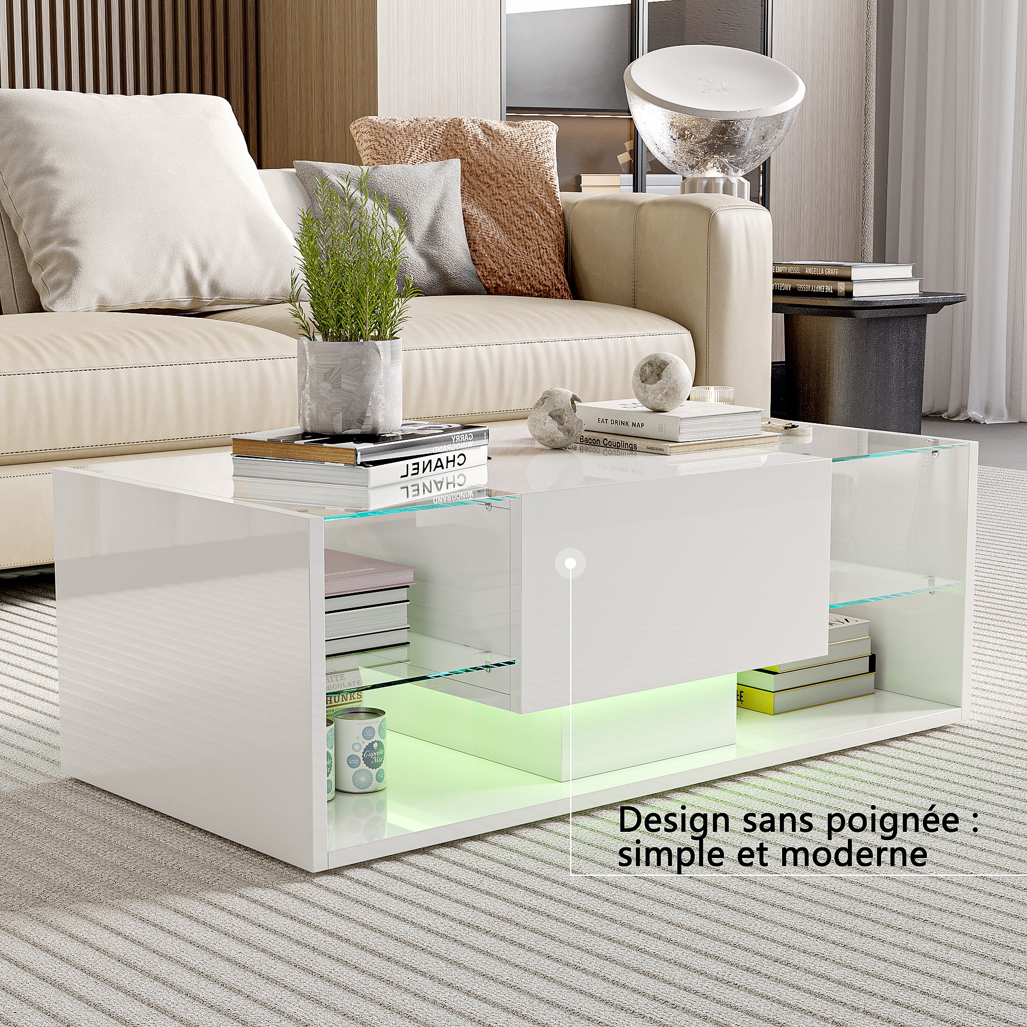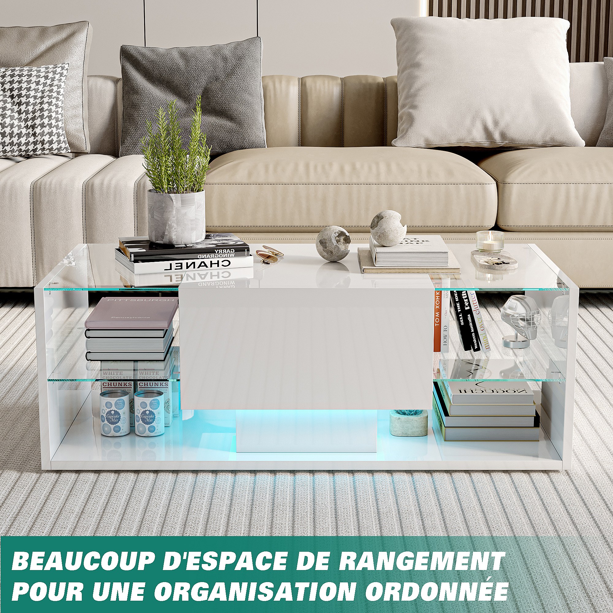 Table basse brillante avec éclairage LED, Table de salon avec étagère d'exposition ouverte et 1 tiroir, Style moderne, Blanc
