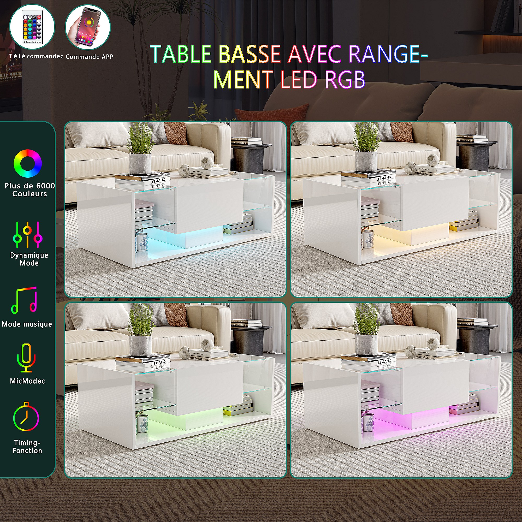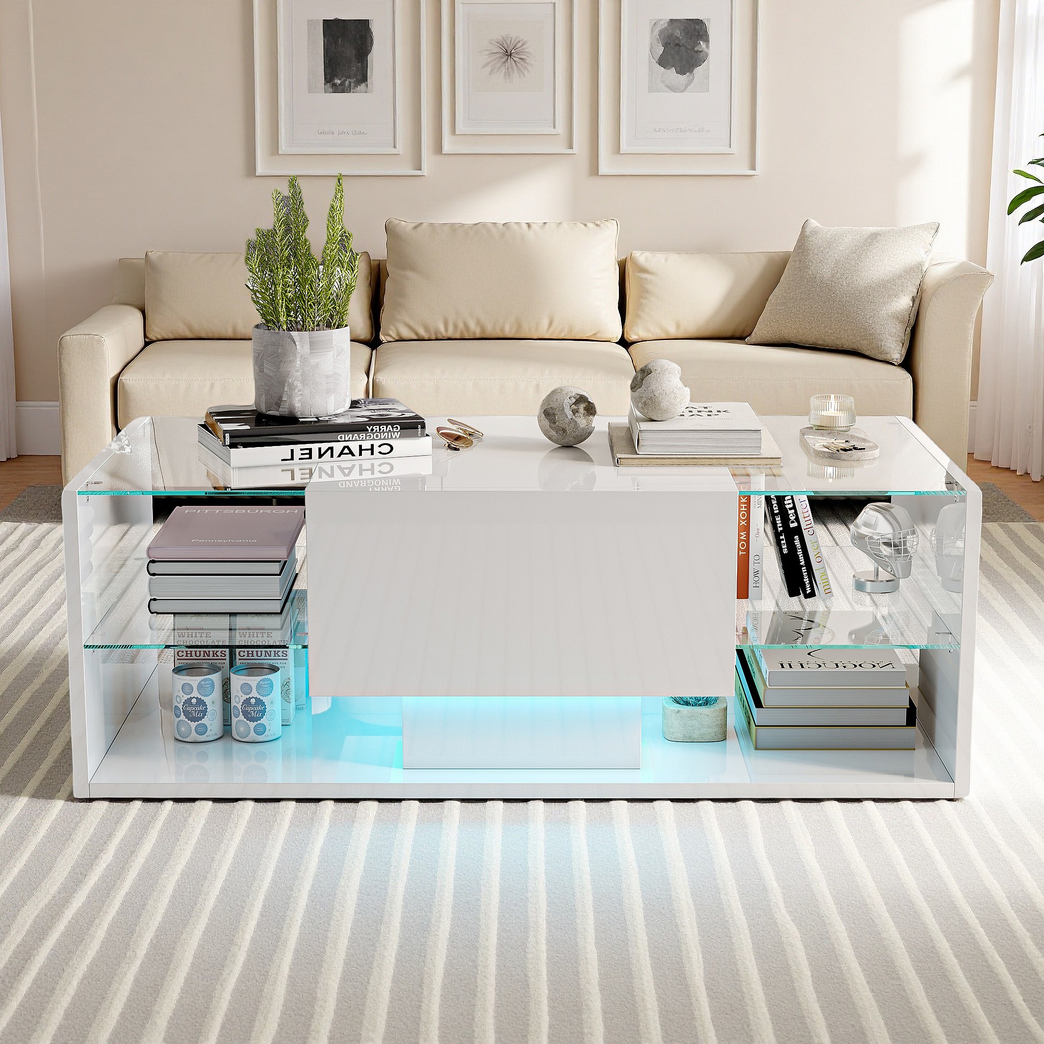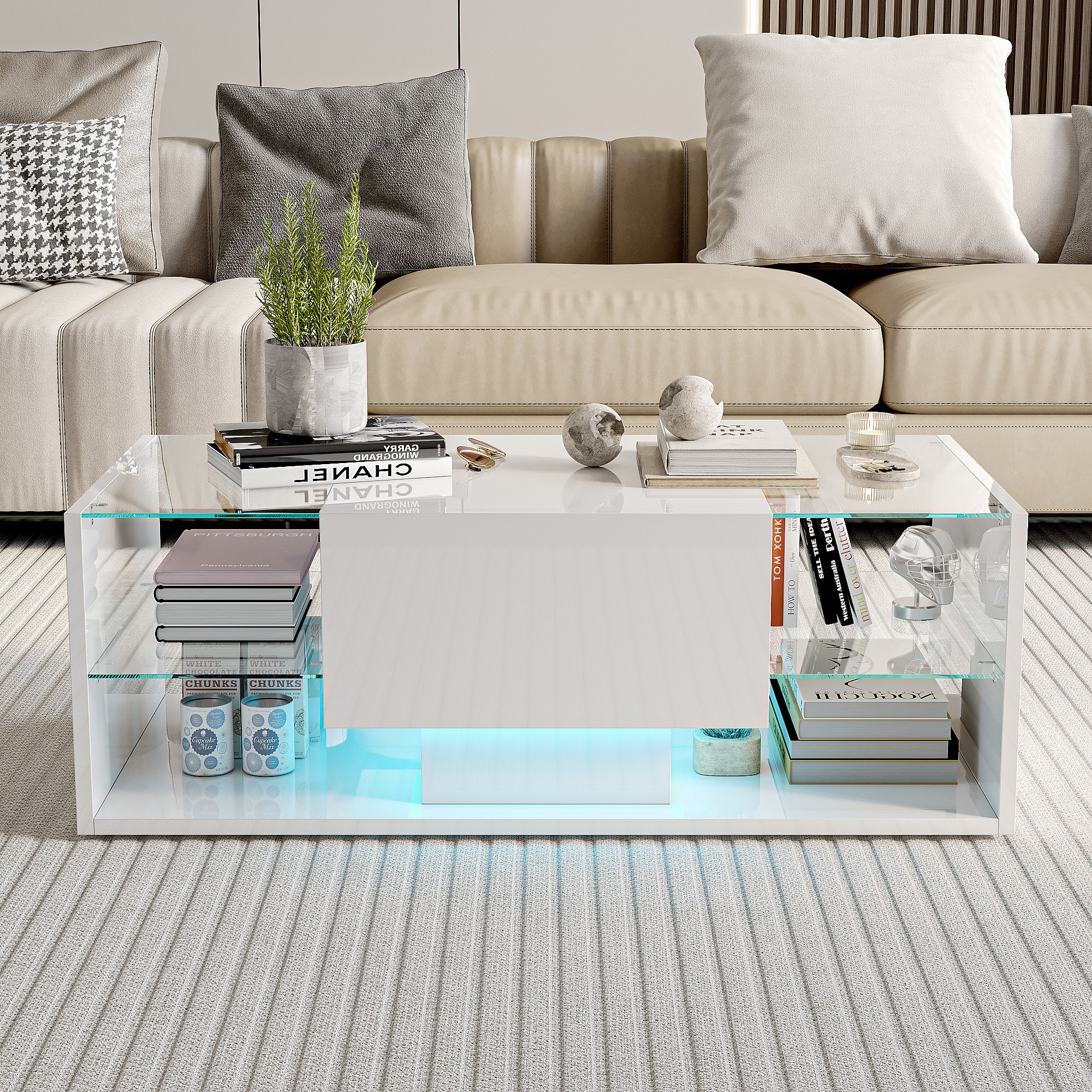 Table basse brillante avec éclairage LED, Table de salon avec étagère d'exposition ouverte et 1 tiroir, Style moderne, Blanc
