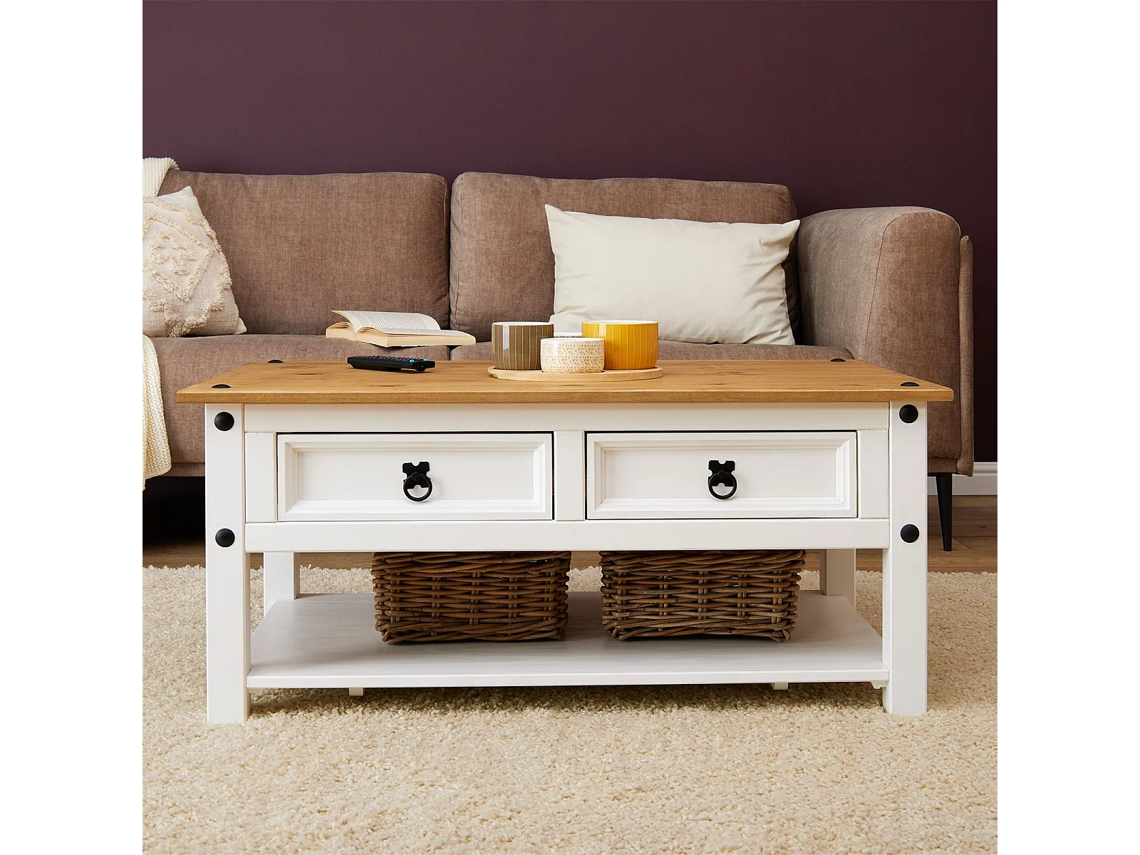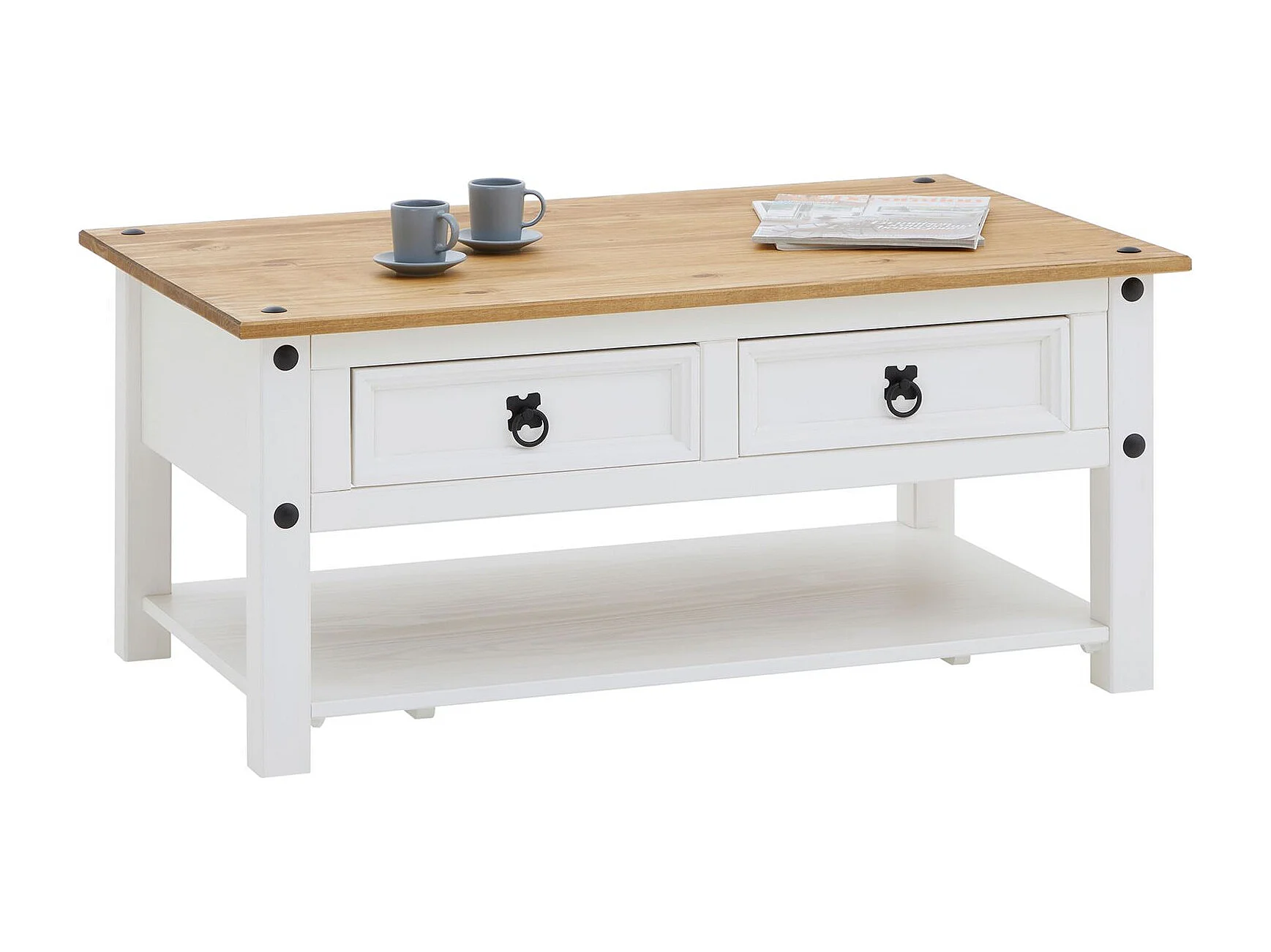 Table basse CAMPO en Bois Massif Blanc et Brun rectangulaire avec 2 Tiroirs et 1 Étagère