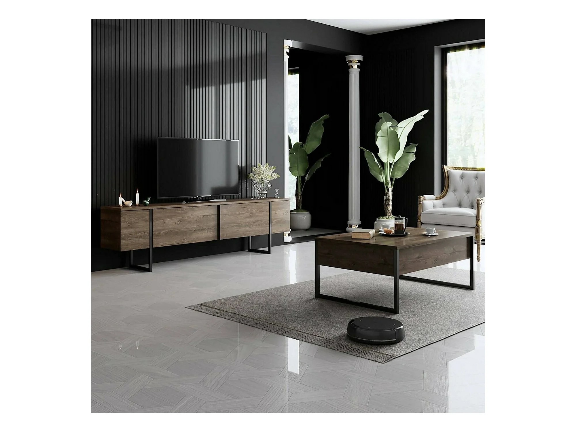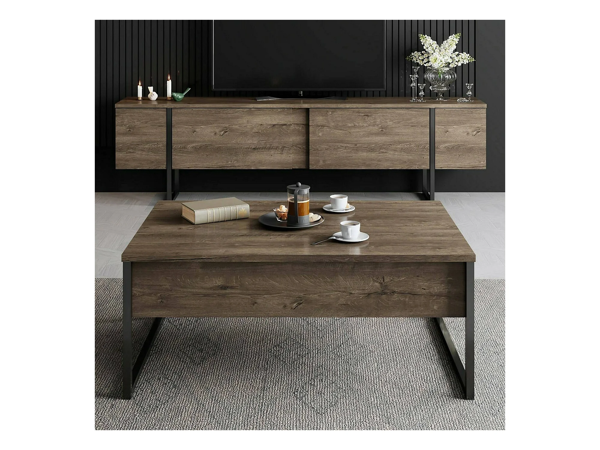 Table basse Canis, Table basse, Porte-revues pour canapé, Etagère de salon, 90x60h40 cm, Noyer et Noir