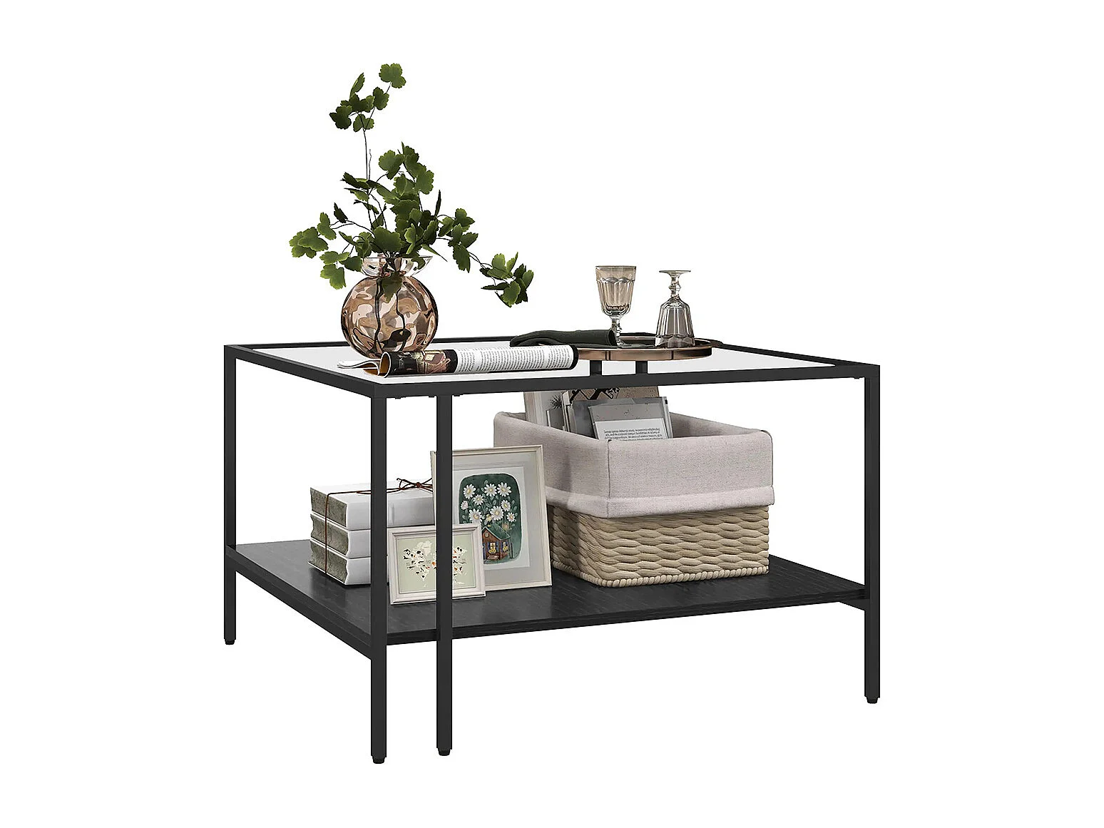Table basse carrée 2 niveaux avec plateau en verre trempé 1 étagère design minimaliste noir