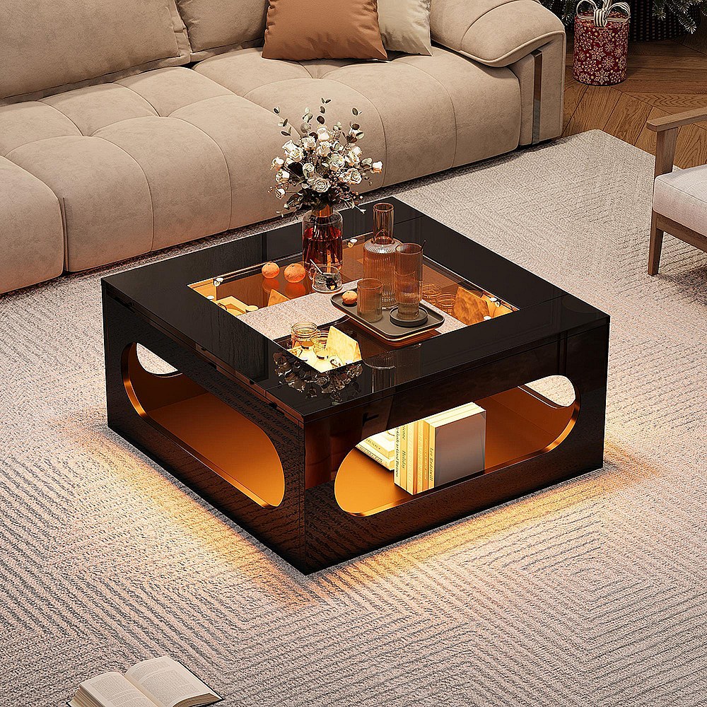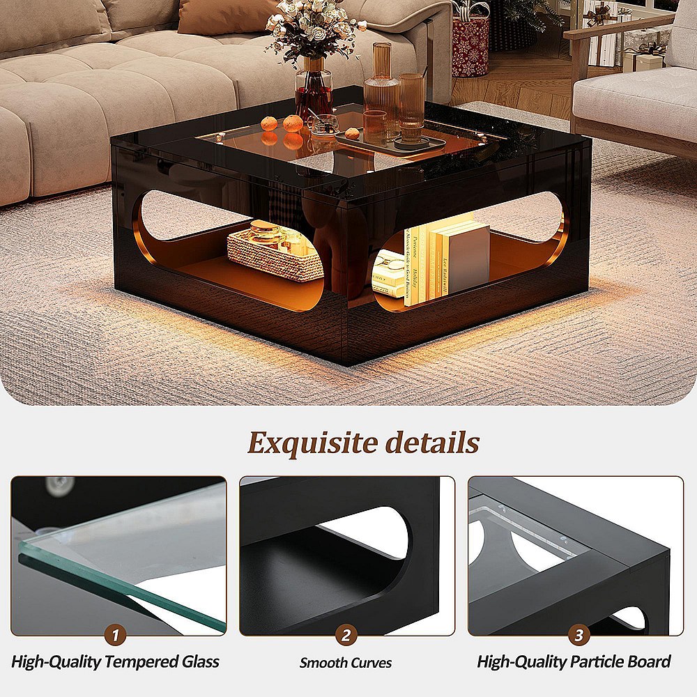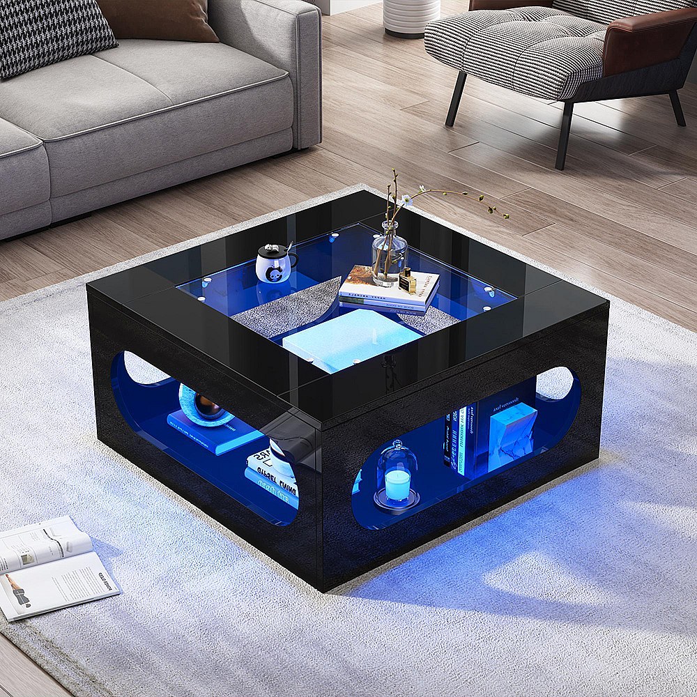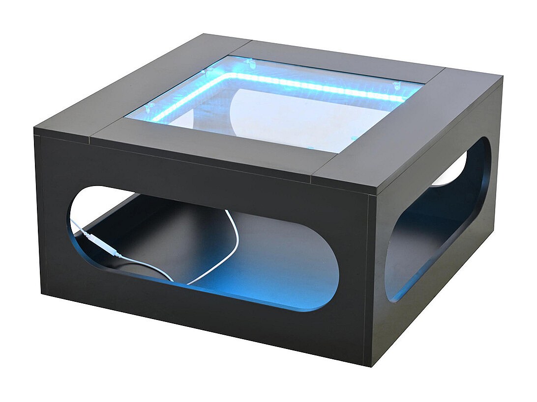 Table basse carrée creuse centre plateau verre trempé LED brillante noire MDF