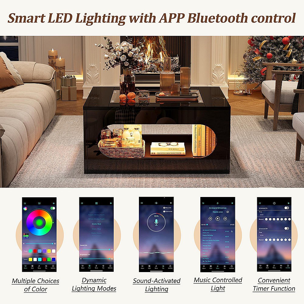 Table basse brillante - 70 x 70 x 36 cm - avec Leds + 2 tiroirs - Aggloméré + verre trempé - noir