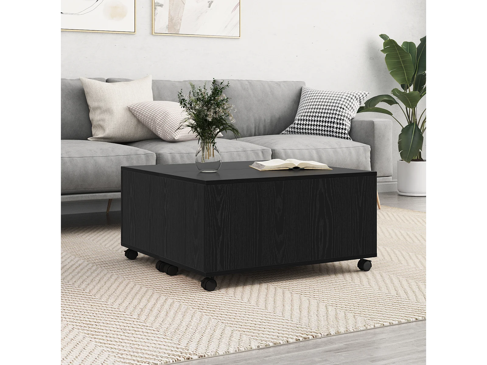 Table basse fonctionnelle avec plateau rotatif 360°, 2 tiroirs et rangement, structure en aggloméré, noir (60x60x38 cm)