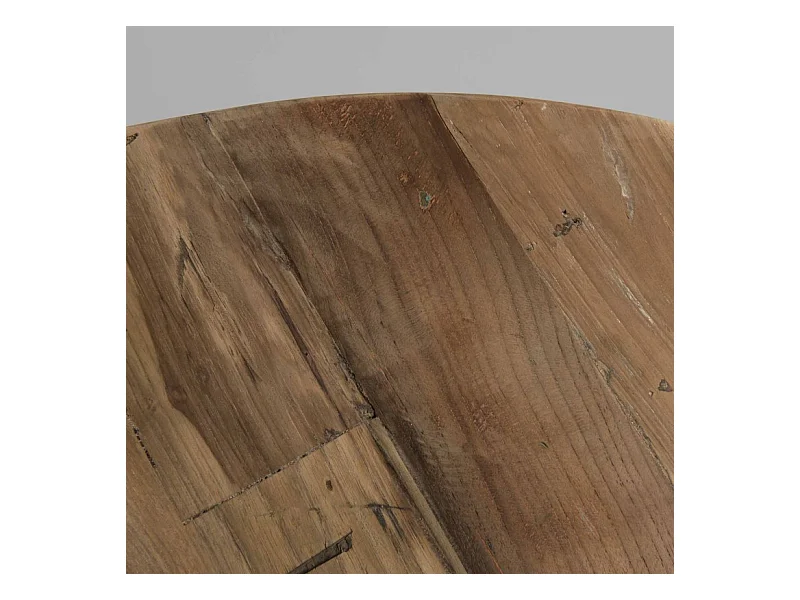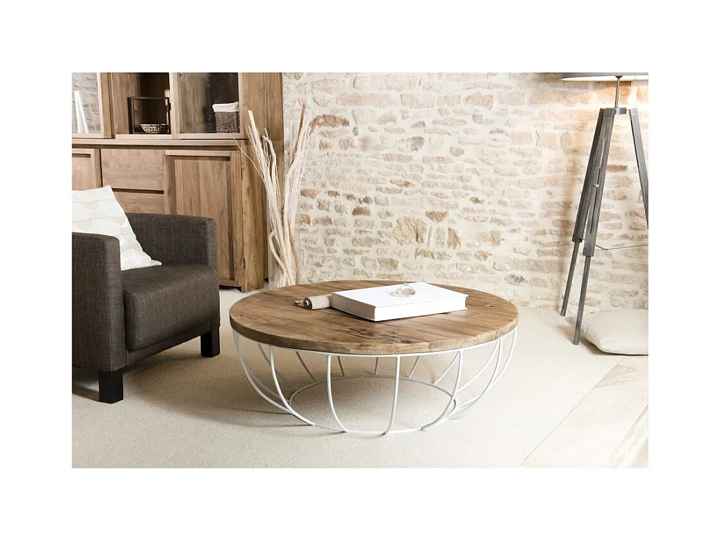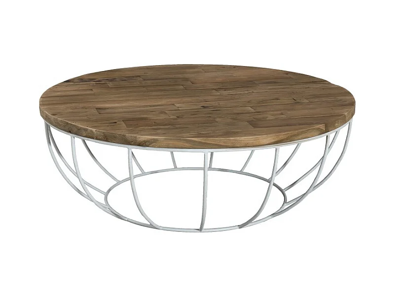 SIXTINE - Table basse coque ronde 100x100cm plateau teck recyclé piétement métal blanc