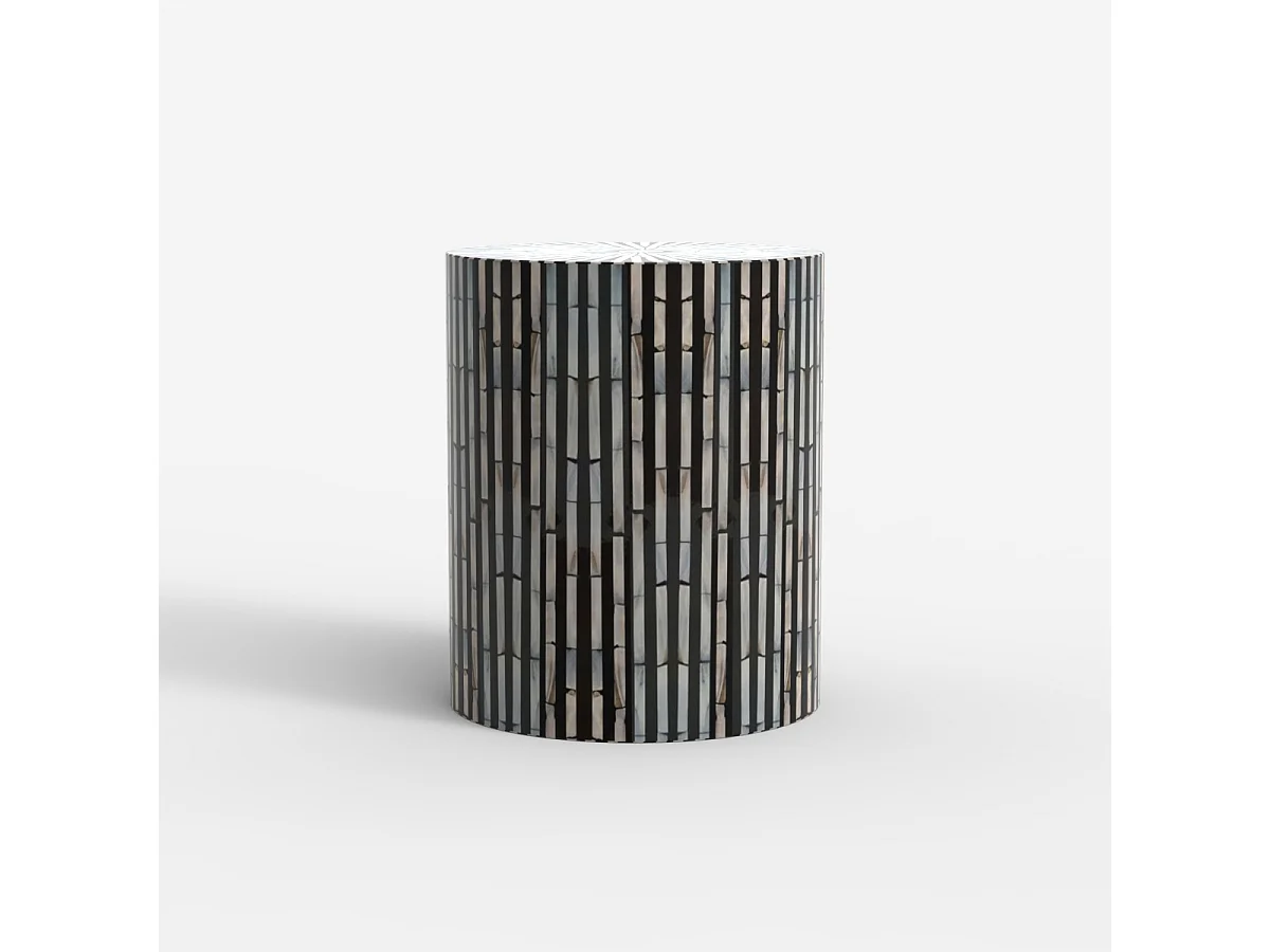 Table basse cylindrique incrustée de nacre blanche noire Ulan