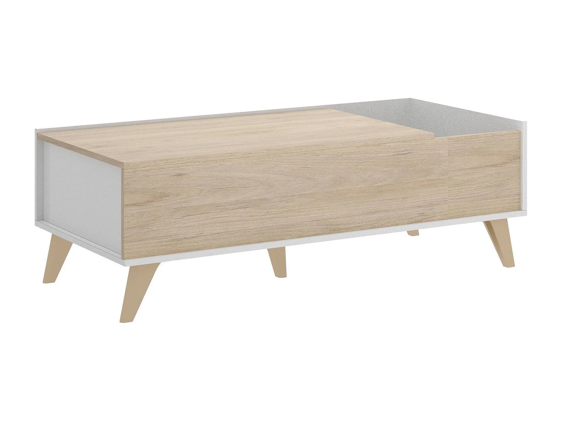 Table basse Dburs, Porte-revues de salon avec compartiment de rangement, Table basse élévatrice basse, 99x60h41 cm, Chêne et Blanc