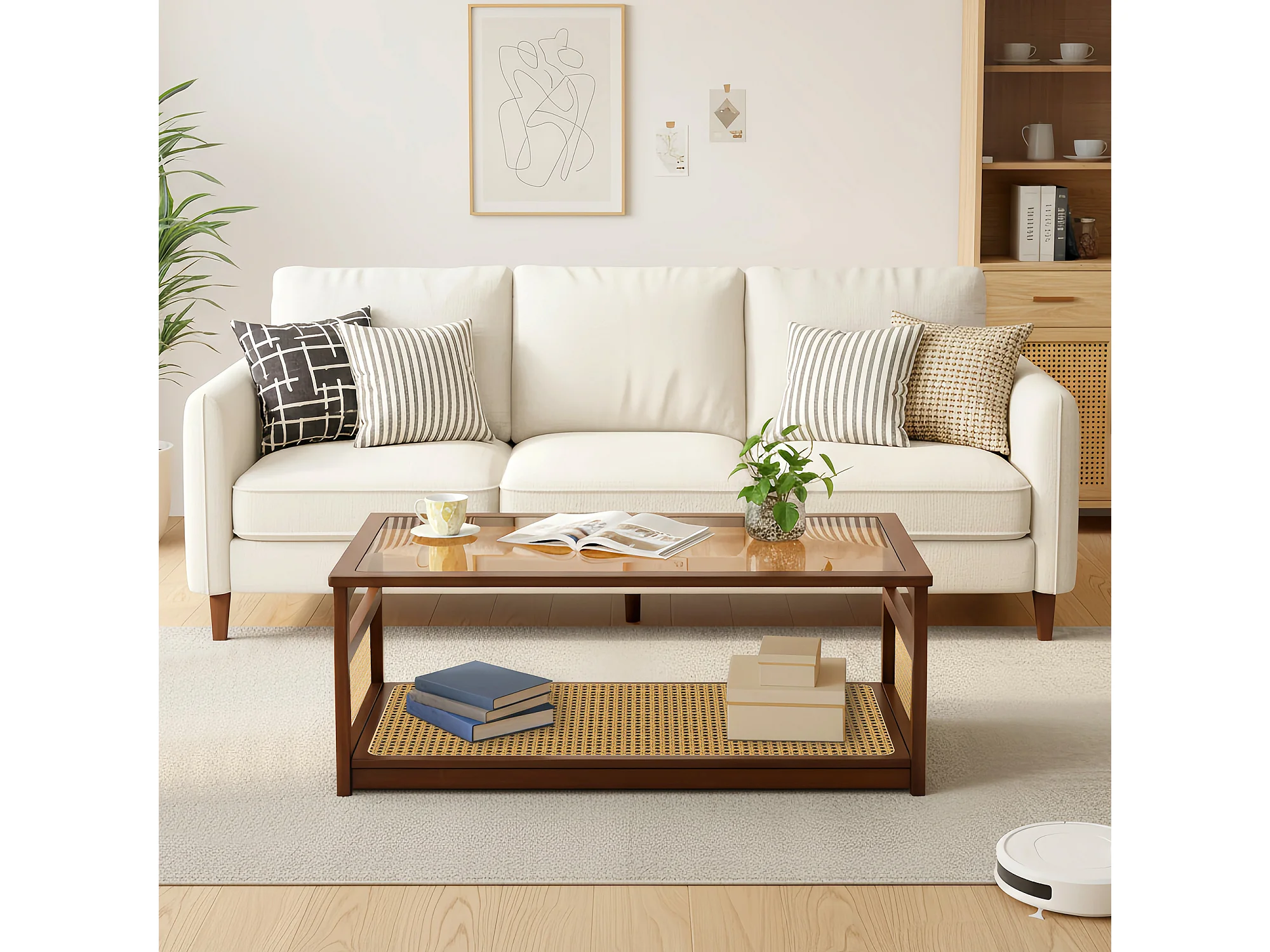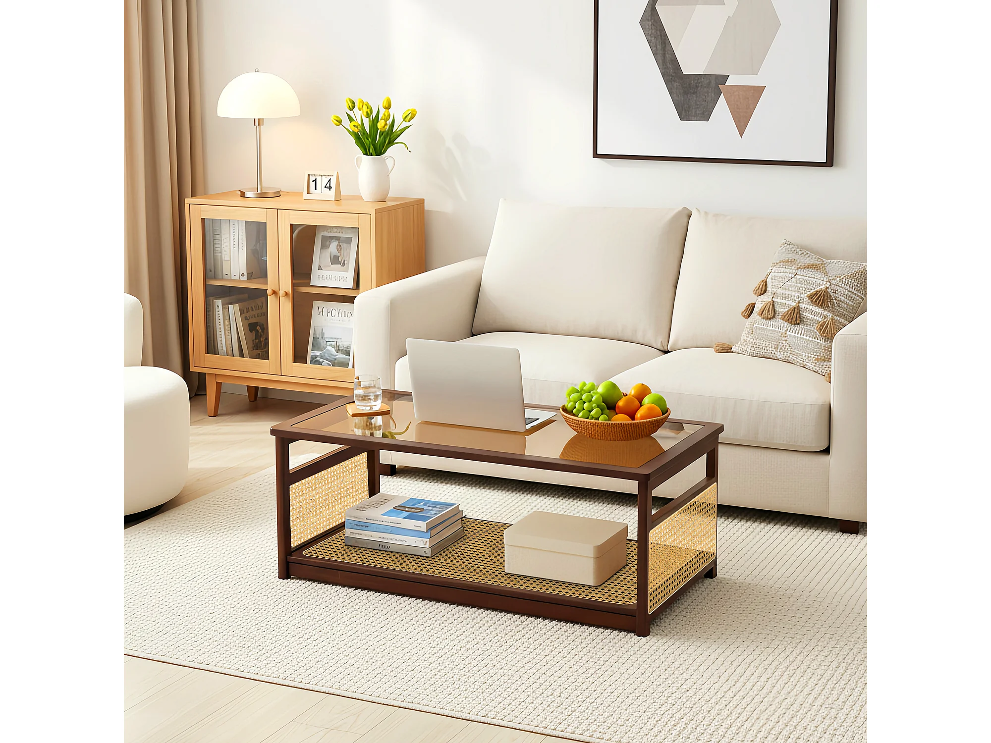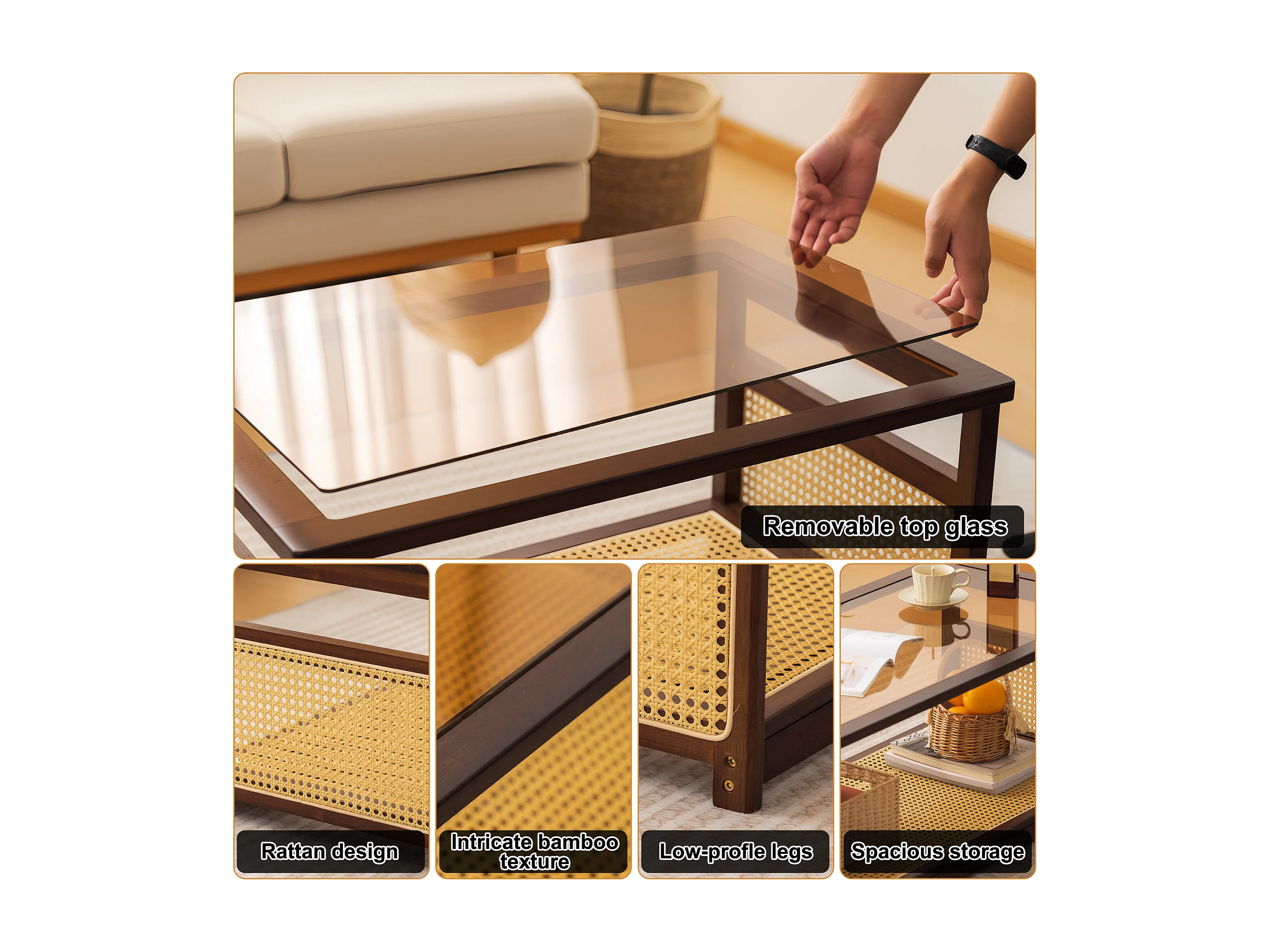 Table basse de salon avec rangement à 2 niveaux, Table rectangulaire en rotin et verre, idéale pour le salon, marron, 108.5 x 53 x 42cm