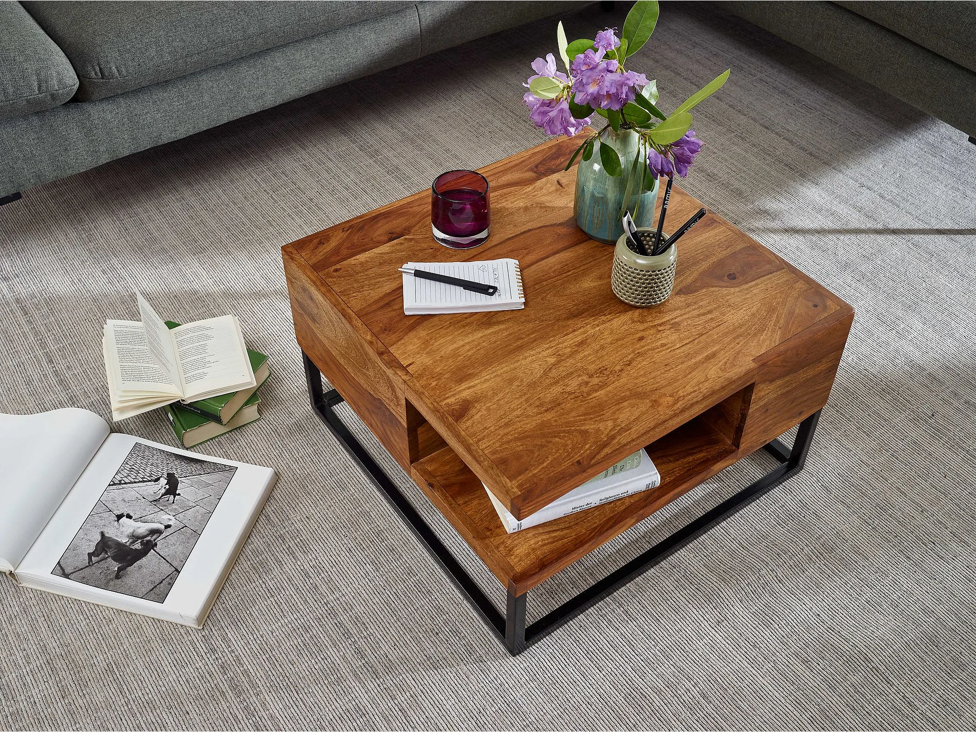Table Basse de Salon Bois Massif Métal 60x60x34,5 cm Carré Table Canapé