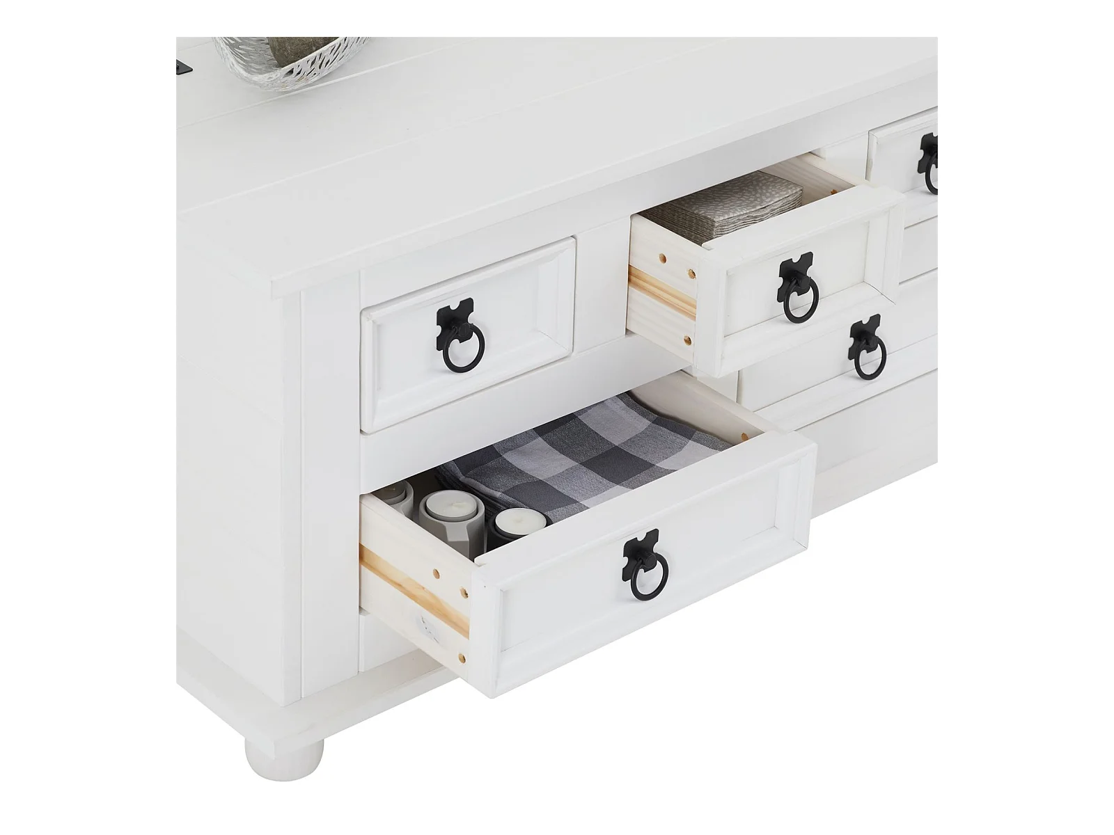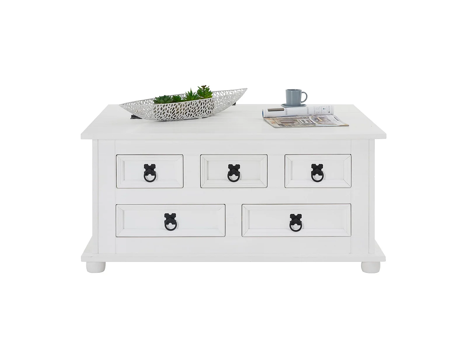 Table basse de salon TEQUILA coffre malle de rangement rectangulaire en bois style mexicain avec 5 tiroirs pin massif lasuré blanc