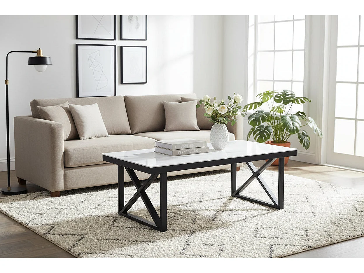 Table Basse LEVANTO Plateau Verre Trempé Marbré Blanc Structure Métal Noir 120x60x45cm