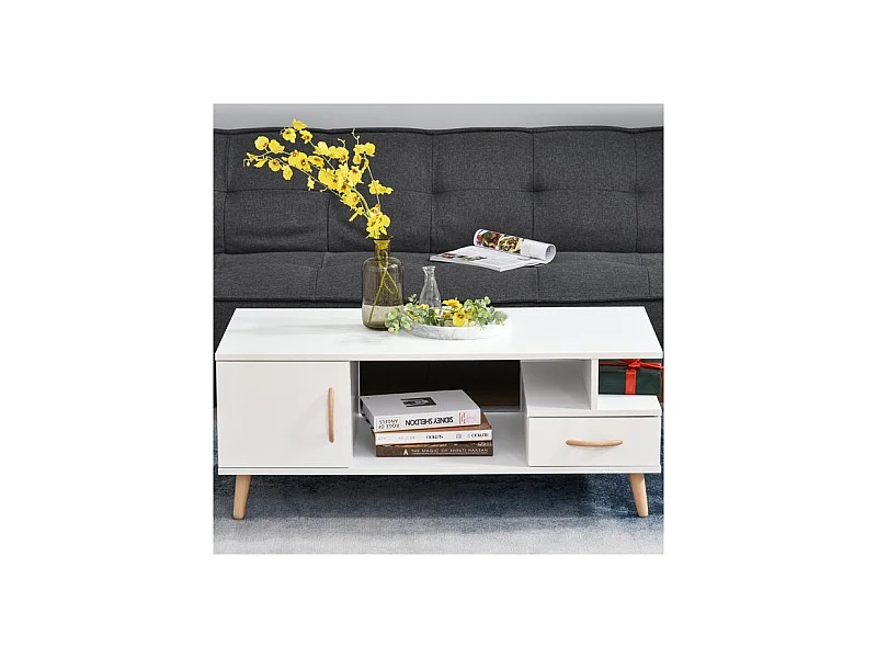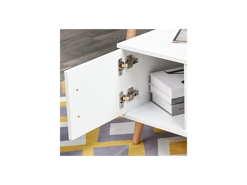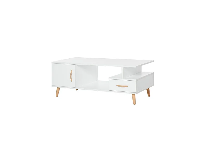 Table basse rectangulaire design scandinave 100L x 50l x 40H cm niche + tiroir & placard bois massif pin panneaux particules blanc