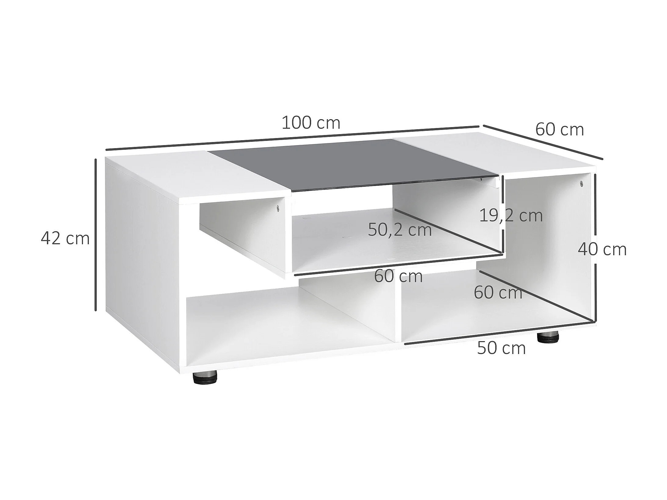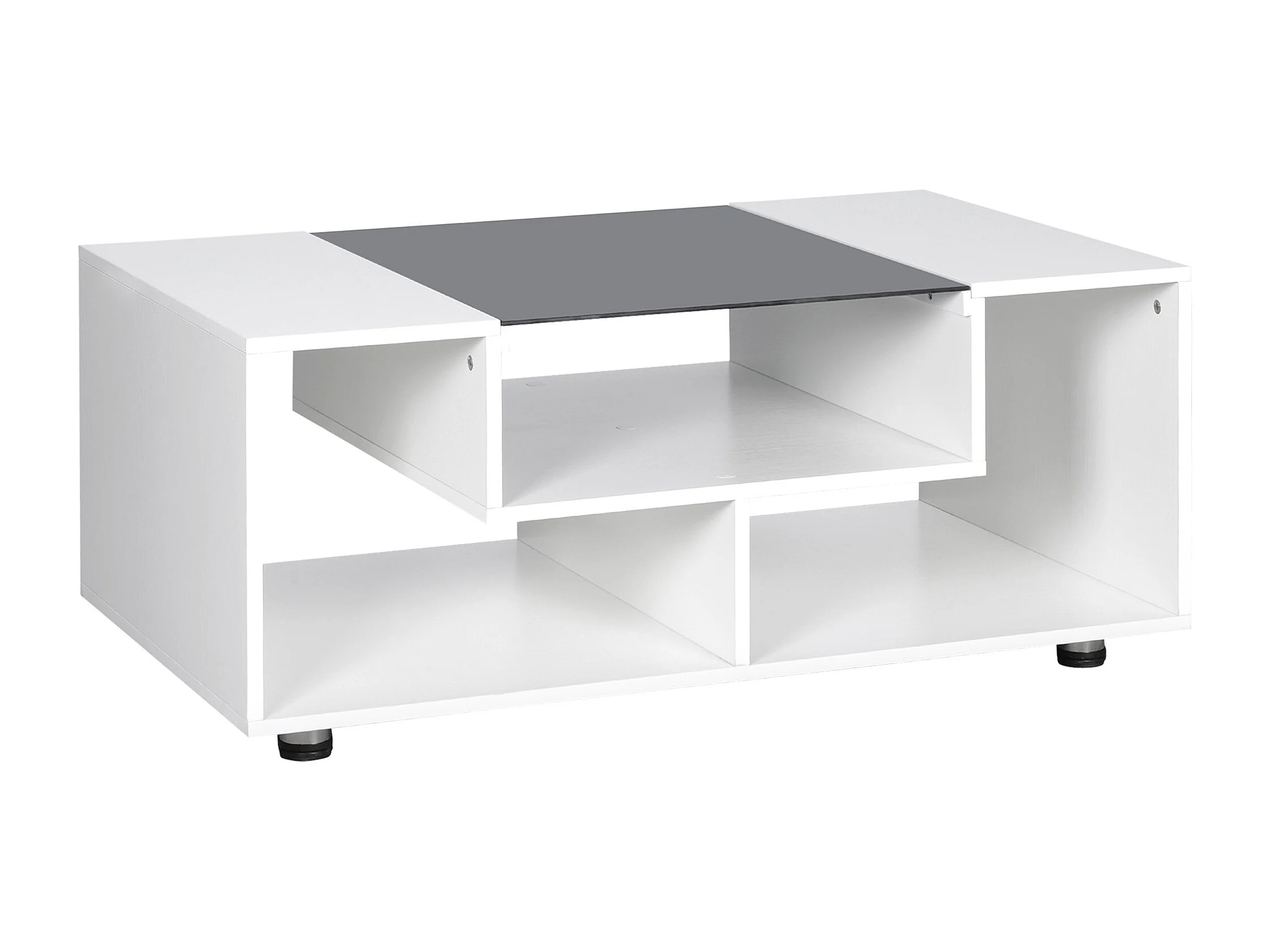 Table basse design contemporain symétrique dim. 100L x 60l x 42H cm 3 niches panneaux particules blanc verre trempé noir