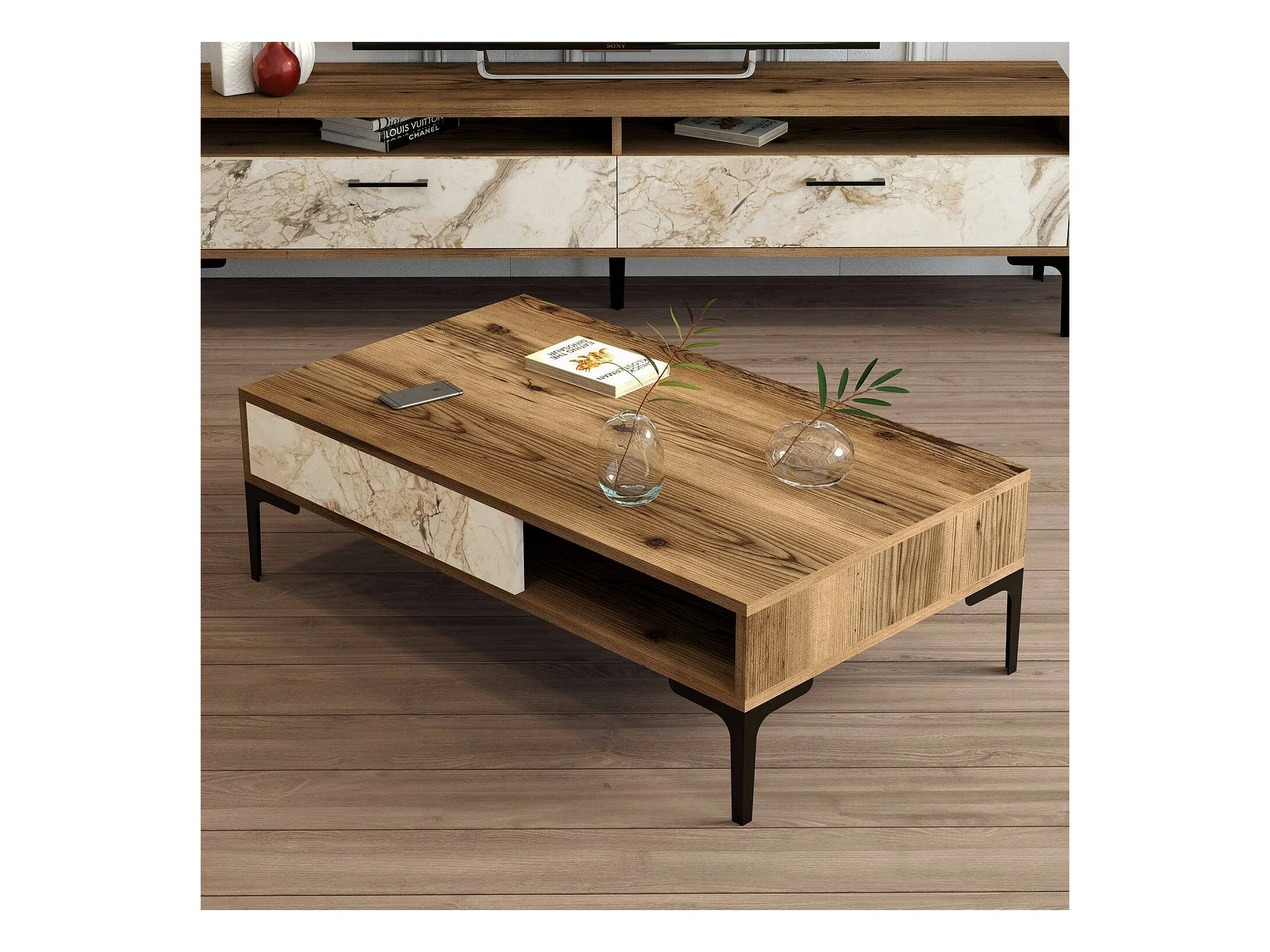 Table basse Diadem, Table basse, Porte-revues pour canapé, Etagère de salon, 105x60h33 cm, Noyer et Blanc