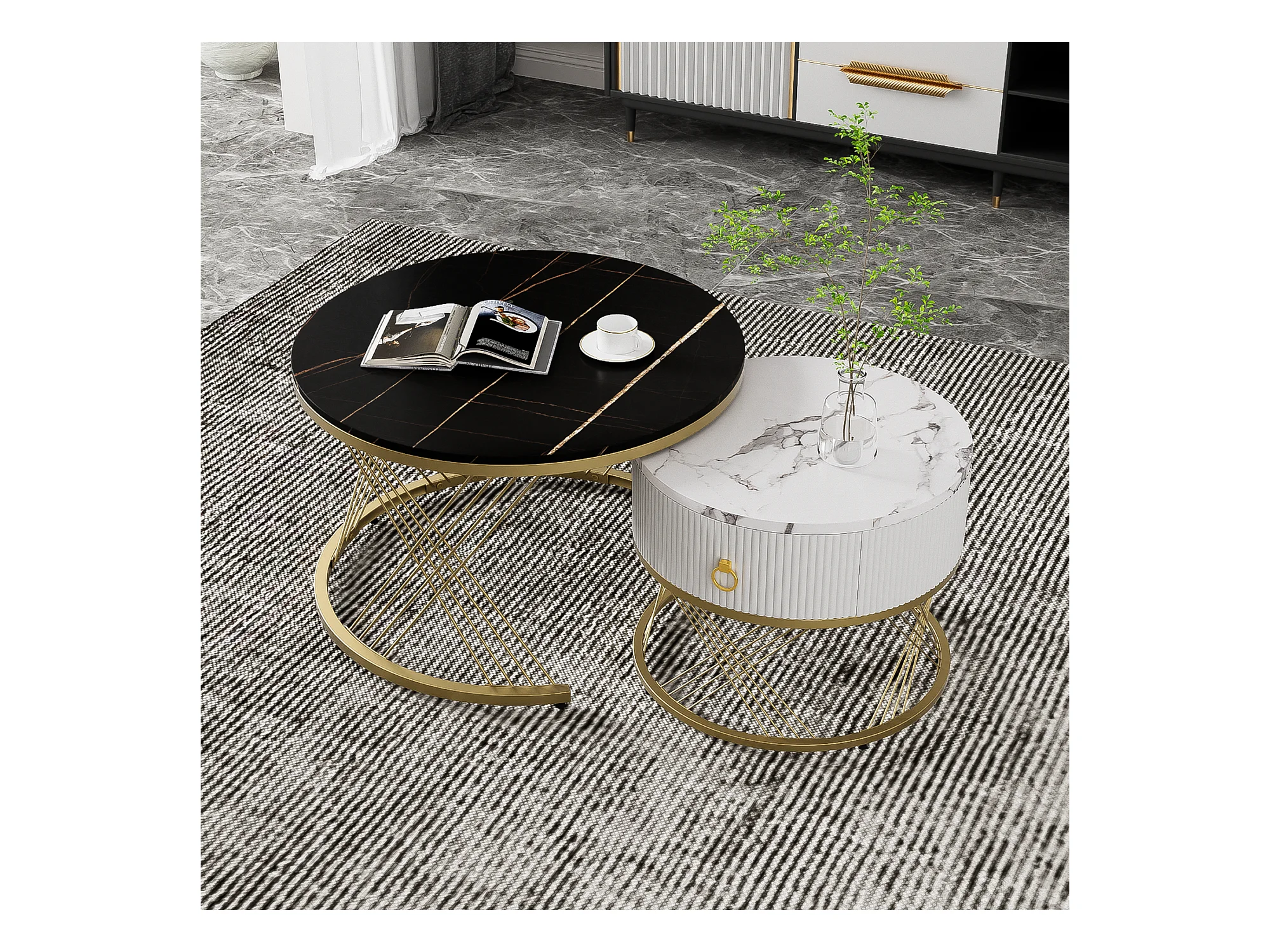 Table basse élégante 2 pièces, effet marbre, décor doré, avec tiroirs