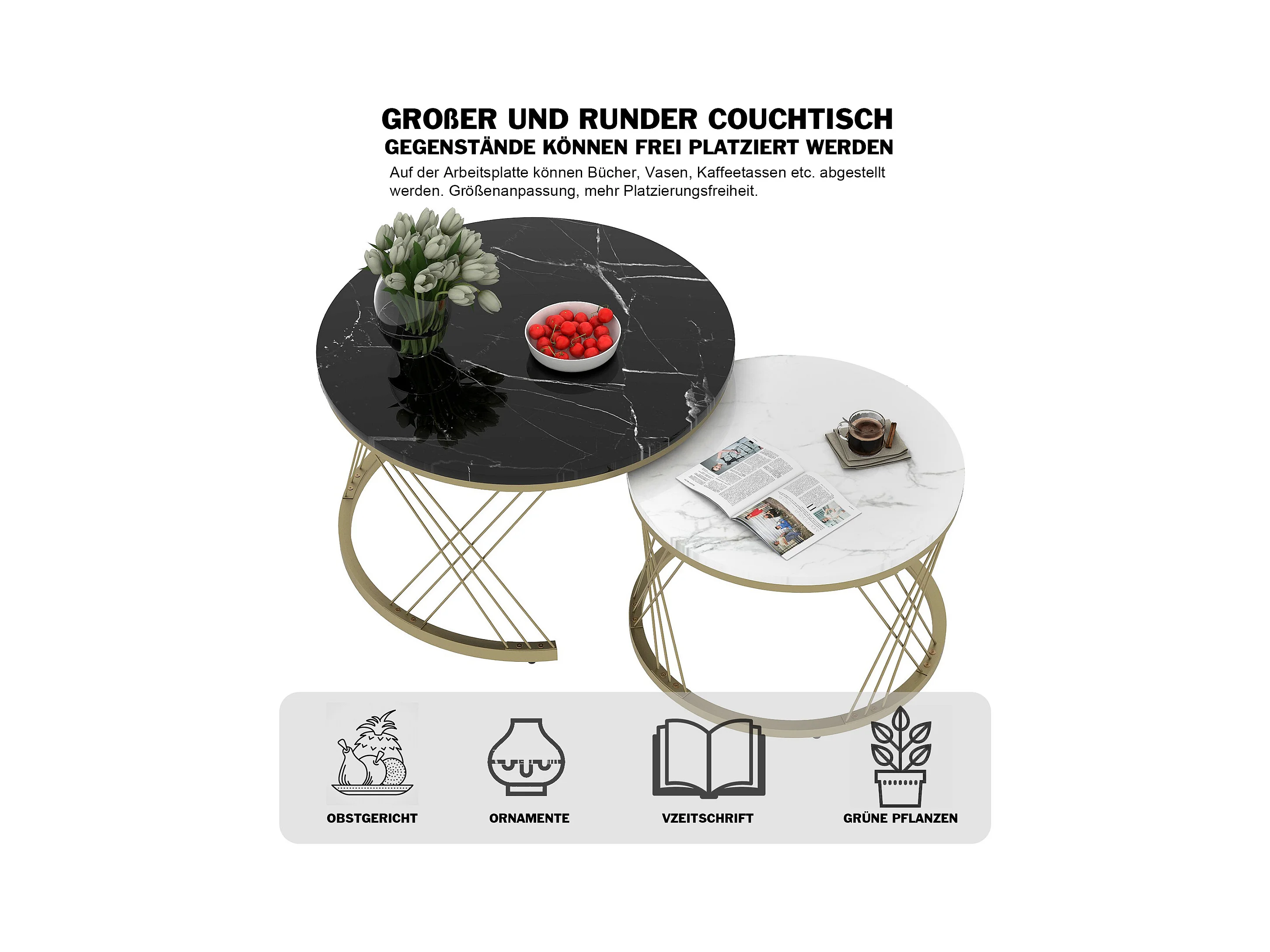 Table Basse Empilable Moderne, Set de 2 Tables Rondes, Finition Imite Marbre, Cadre Métallique Doré, Table d'appoint pour Salon, Bureau